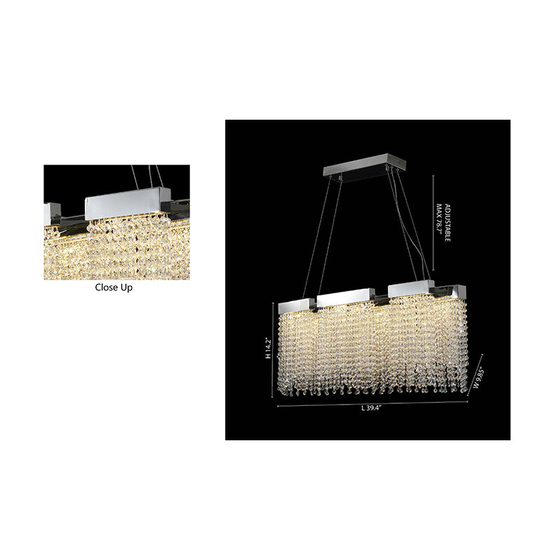 This exquisite LED lighting is in a chrome finish. The frame is in a rectangular shape and made out of metal. It comes with clear beaded crystals draping around top of the fixture. This modern chandelier will lend a romantic contemporary feel to a variety of home decors.