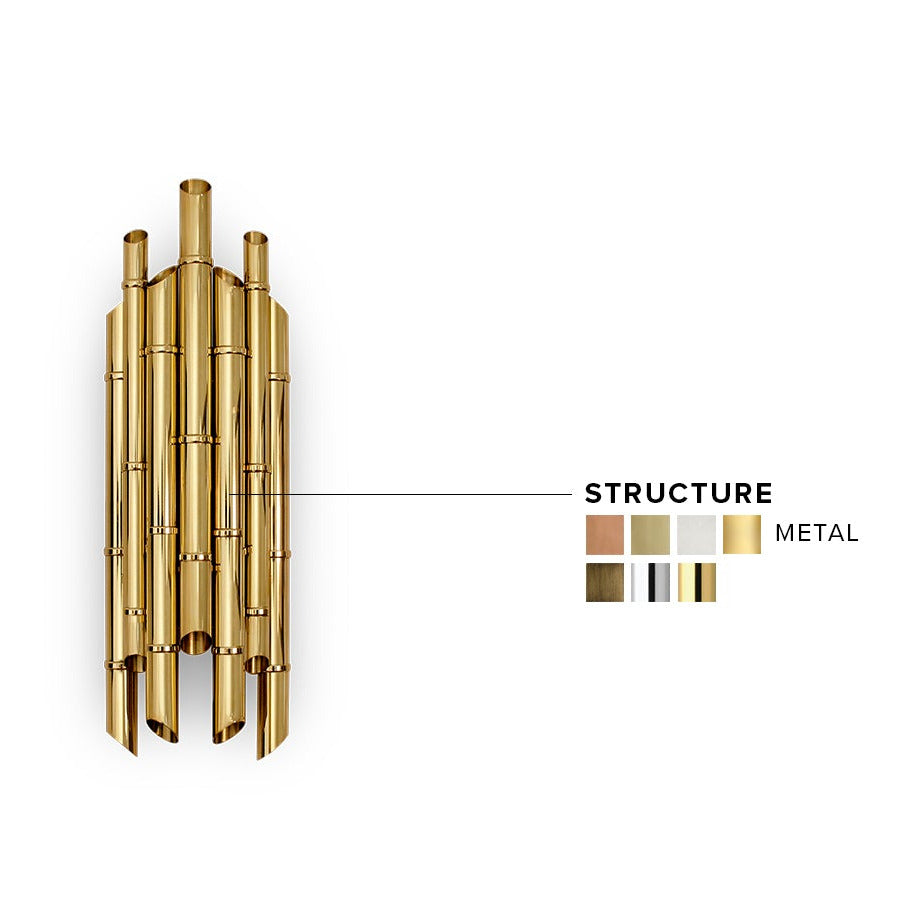 The Saki Wall Light by BRABBU is structured in gold-plated brass. Inspired by the unforgettable Japanese island group, Sakishima Islands, this modern wall light will brighten up your modern interior design.