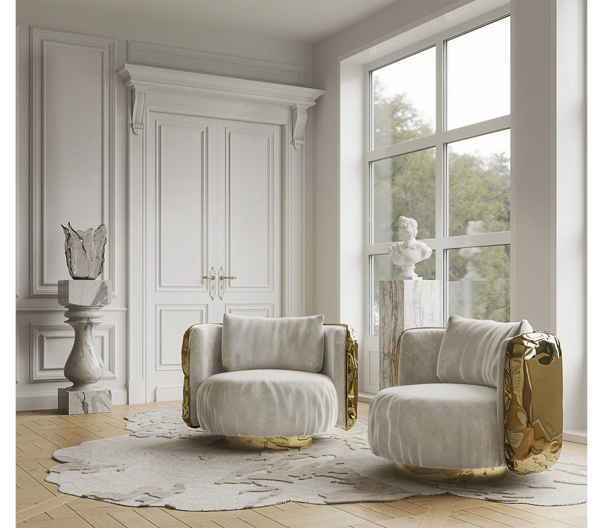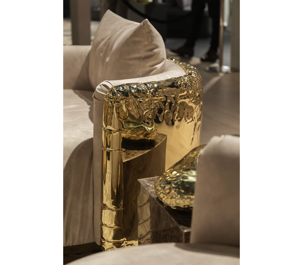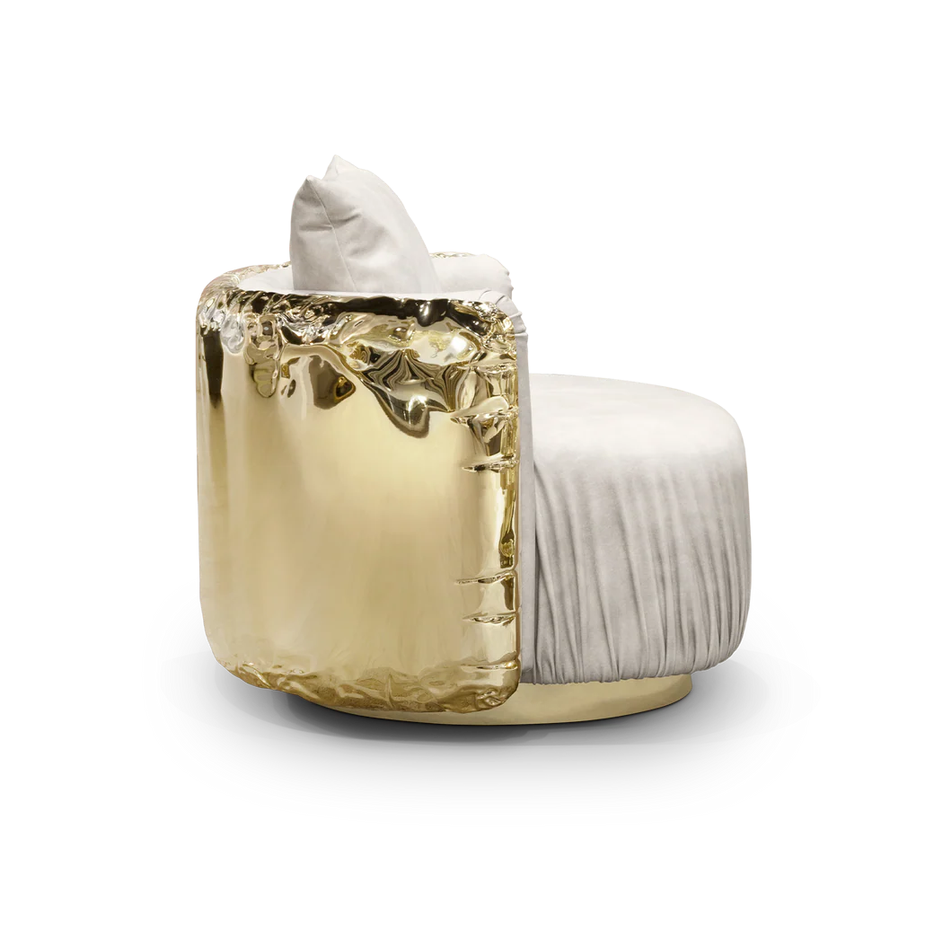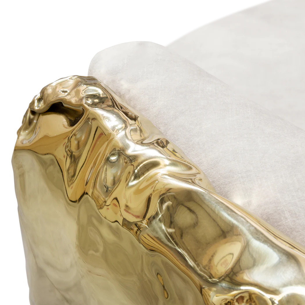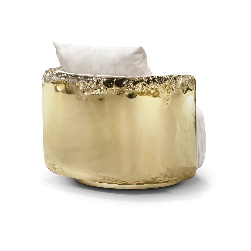 The sumptuous Imperfectio Armchair is the expression of imperfect aesthetic and the appeal of authentic art that is truer to life. An accent armchair that praises artisanal work as the ultimate form of art that is quite intentionally imperfect. Through its unique existence and shapes, the modern and round armchair determines its history. The irregularities and flaws over the manual hammered brass expose the beauty of imperfection. Some parts are roughly asymmetrical at the surface yet comfortable and smooth in a peculiar way to excite a desire for complementing your living room.