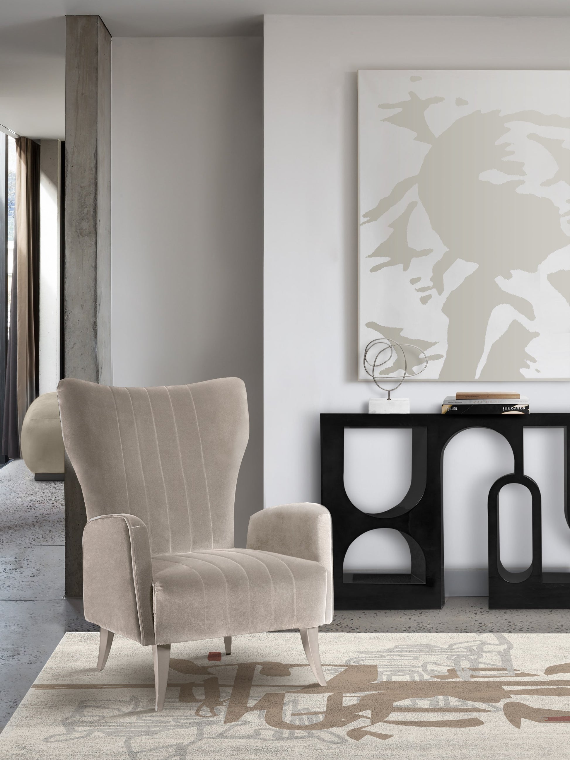 The Davis Armchair is upholstered in cotton velvet, having a high back winged design and legs in matte lacquered. Inspired by the Davis Sea, alongside the East Antarctica coast, this modern contemporary high back winged armchair will bring elegance and sophistication into your modern interior design.