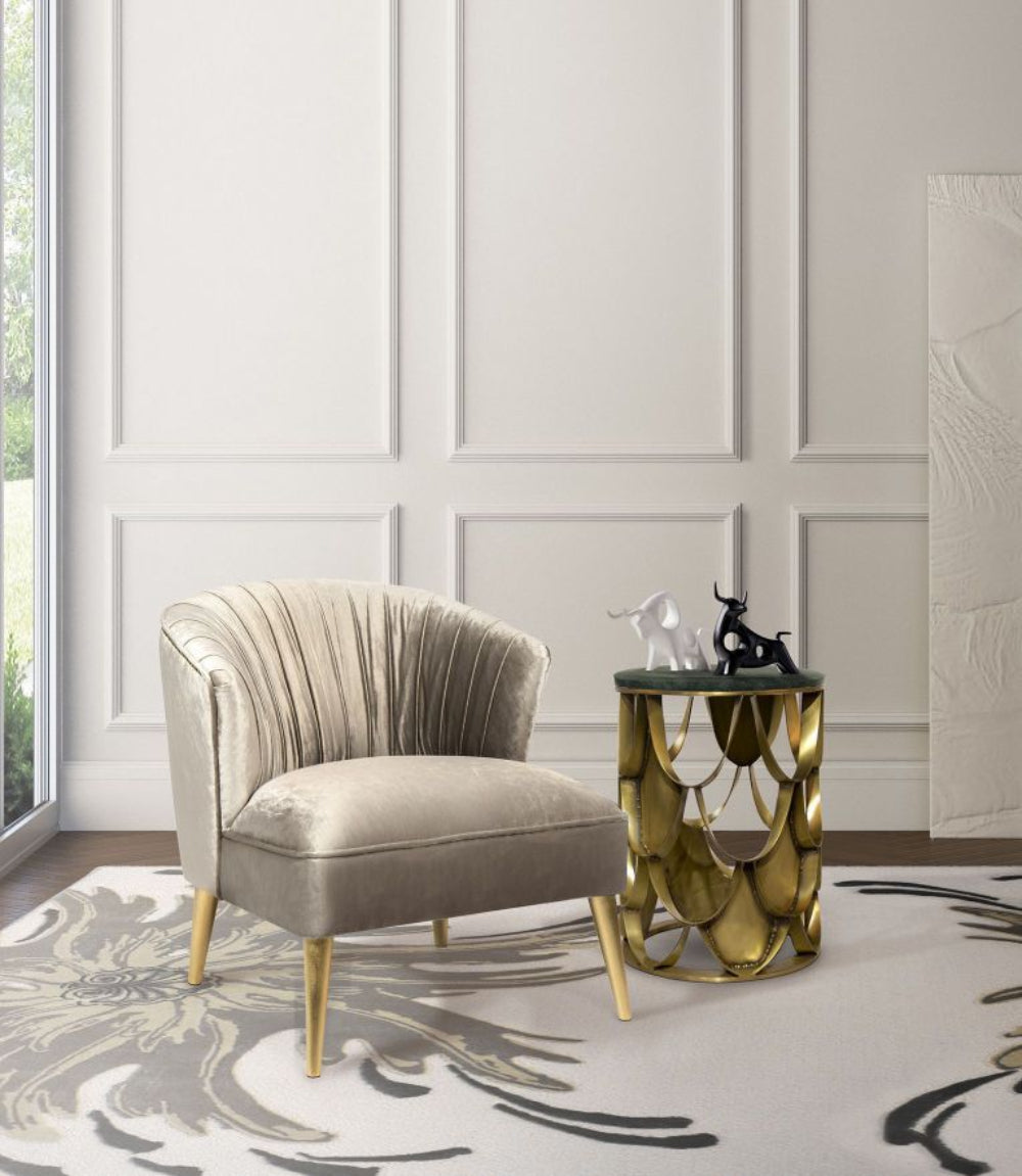 The Nuka Armchair is upholstered in cotton velvet with nailhead trim in gold polished and legs in glossy gold leaf, making this a unique sophisticated armchair curved back modern design. Inspired by the Nuka Glacier in Alaska, this modern grey velvet curved back armchair will be the perfect choice for a modern living room design.