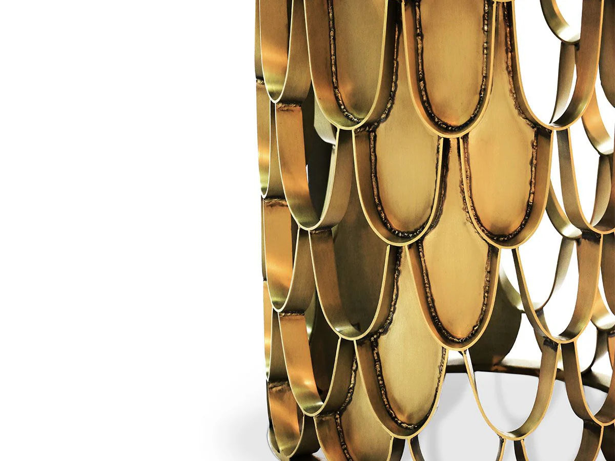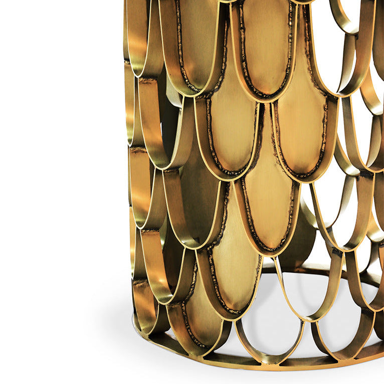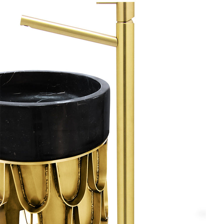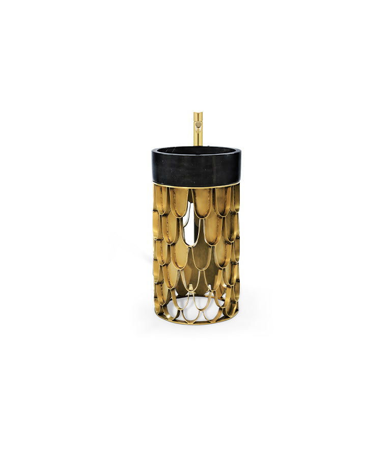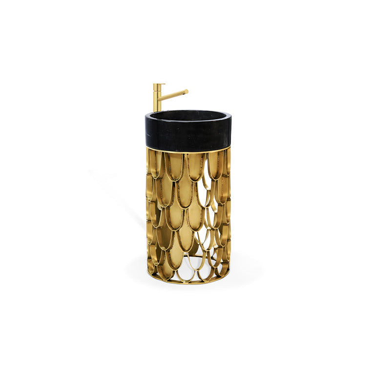 Koi is a contemporary pedestal sink with a single-aged brushed brass finish and a sturdy, long-lasting construction. This freestanding offers a particularly stunning optical illusion of meshwork because it employs a scale pattern based on the koi carp. With just a few details, one can experience true luxury thanks to the countertop sink crafted from Nero Marquina marble.
