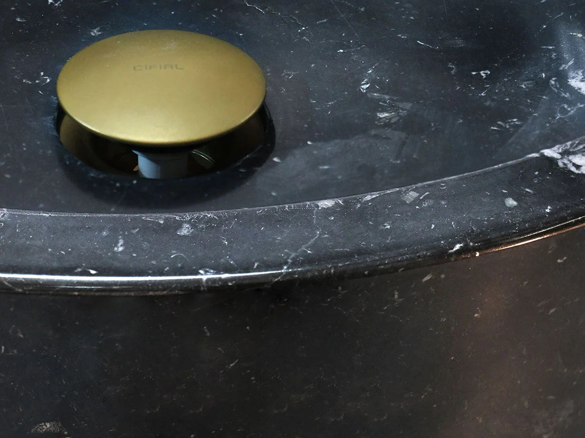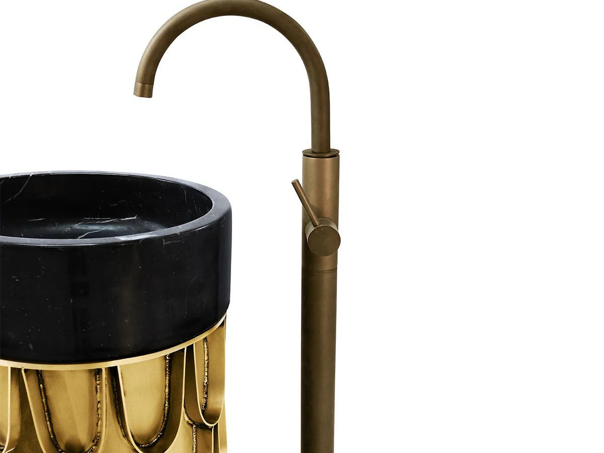 Structure: Brushed Brass Matte, Matt Varnish; Sink: Nero Marquina Marble; Water drainage: Wall/Floor