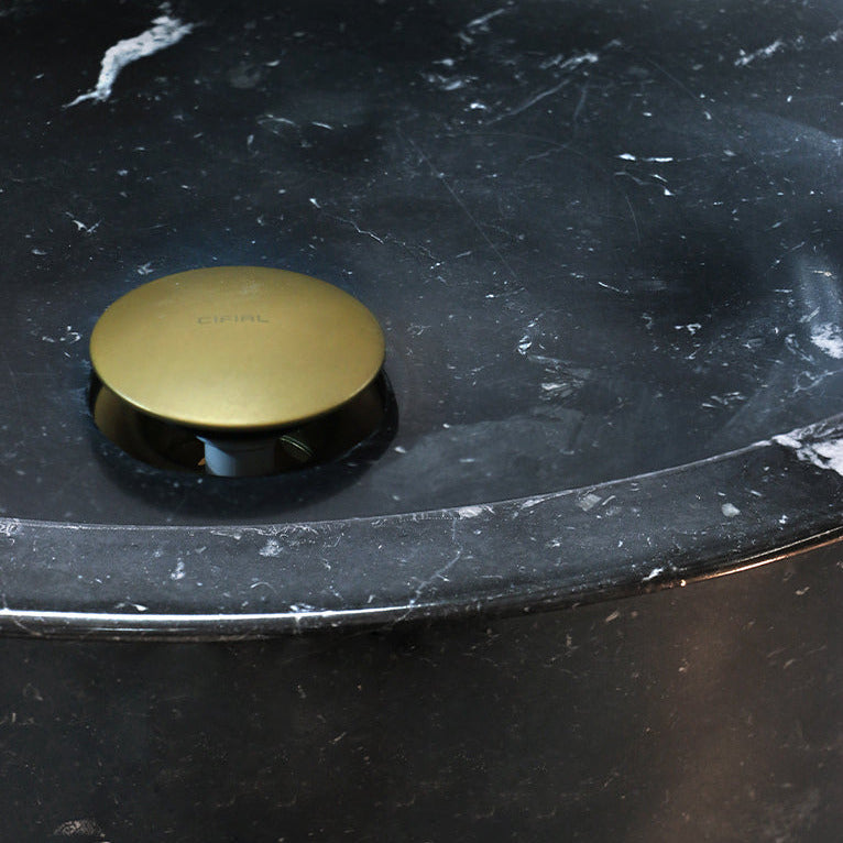 Koi Pedestal Sink: Brushed Brass Matte and Sink in Black Marble