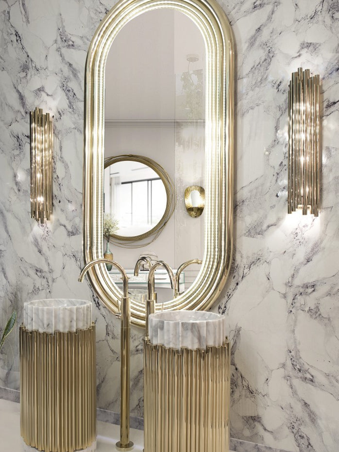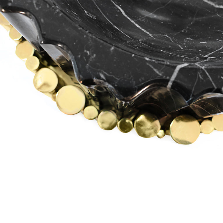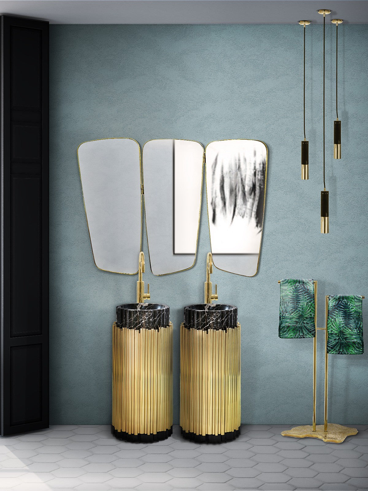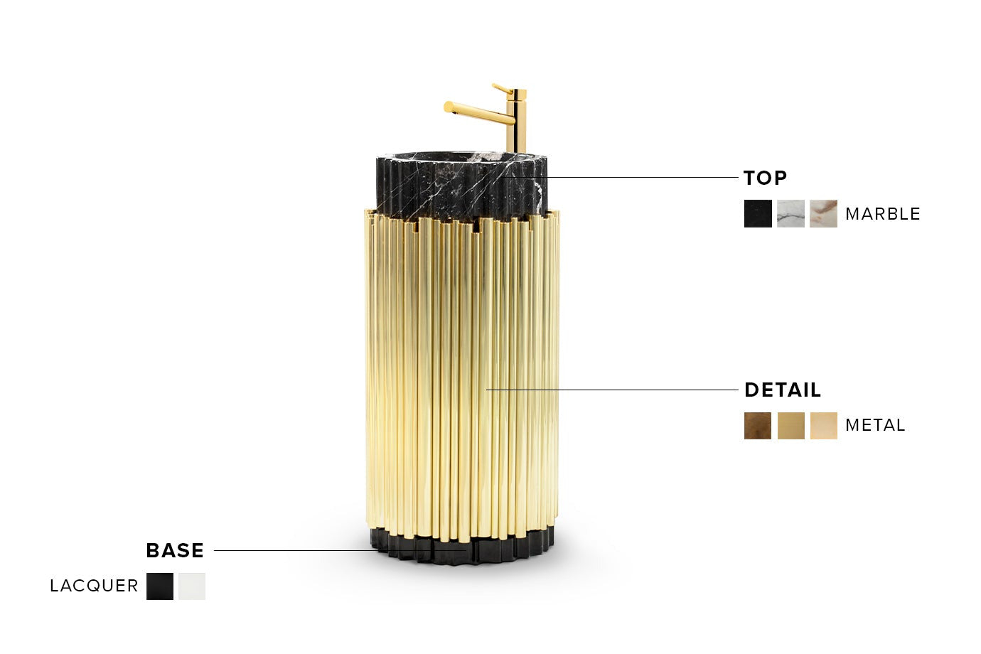 The Symphony Bathroom Pedestal Sink is handmade by experienced craftsmen, that master its beauty until perfection, achieving a melodic design that will certainly stick in your mind. featuring a cluster of polished brass tubes and being made of Nero Marquina Marble with a cogwheel-shaped design, there is no other luxury bathroom pedestal sink that can compete with its beauty.