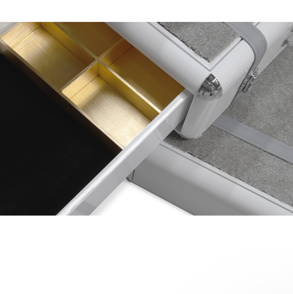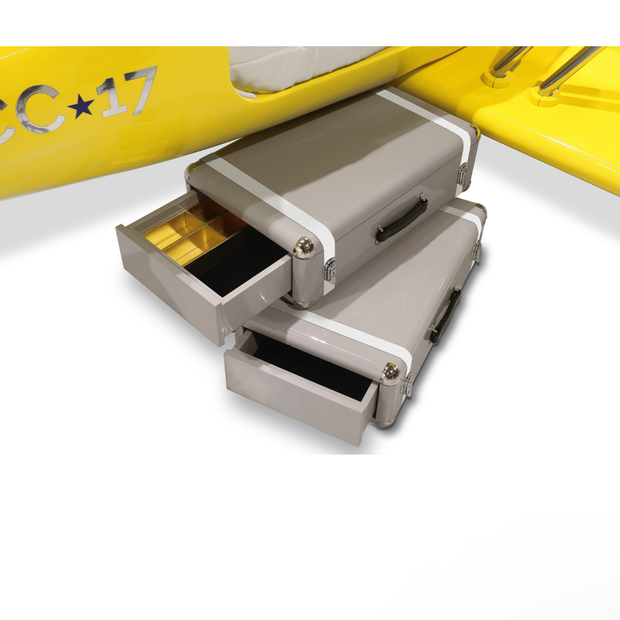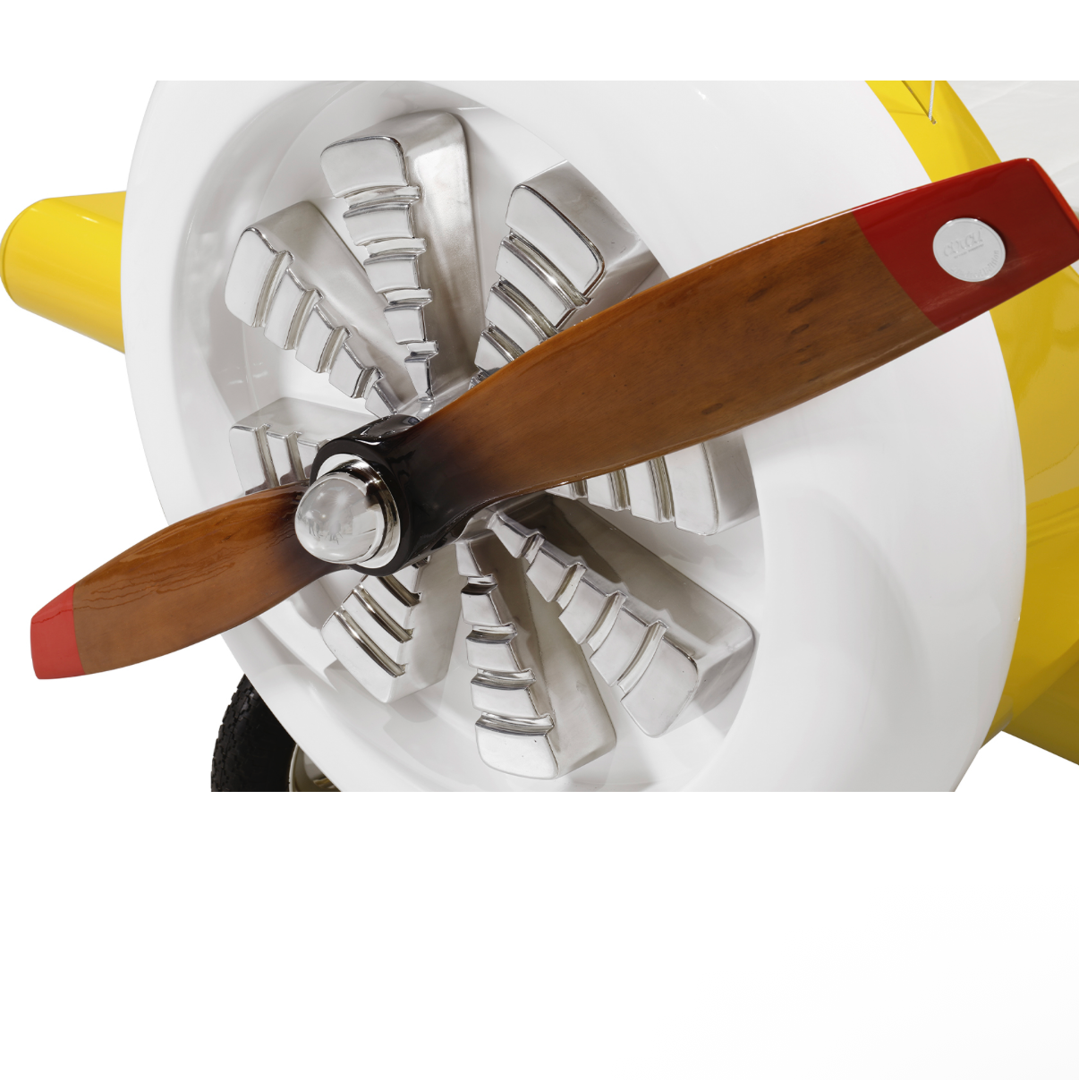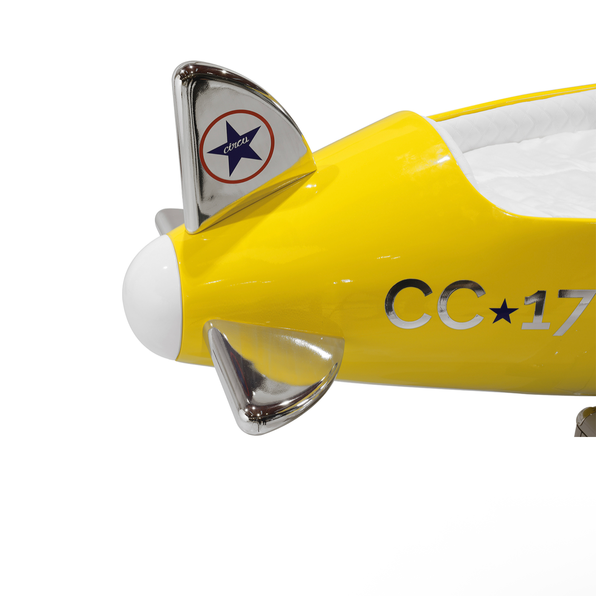 The body is entirely made of fiberglass with glossy varnish applied and chrome plated finishes in the engine and wheels. The Sky B Plane has several storage compartments and the top wing is designed to be used as a bookshelf. The decorative suitcases include secret storage compartments and allow easy access to the bed.
