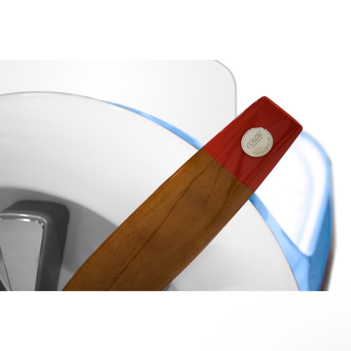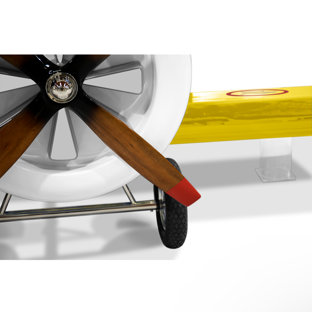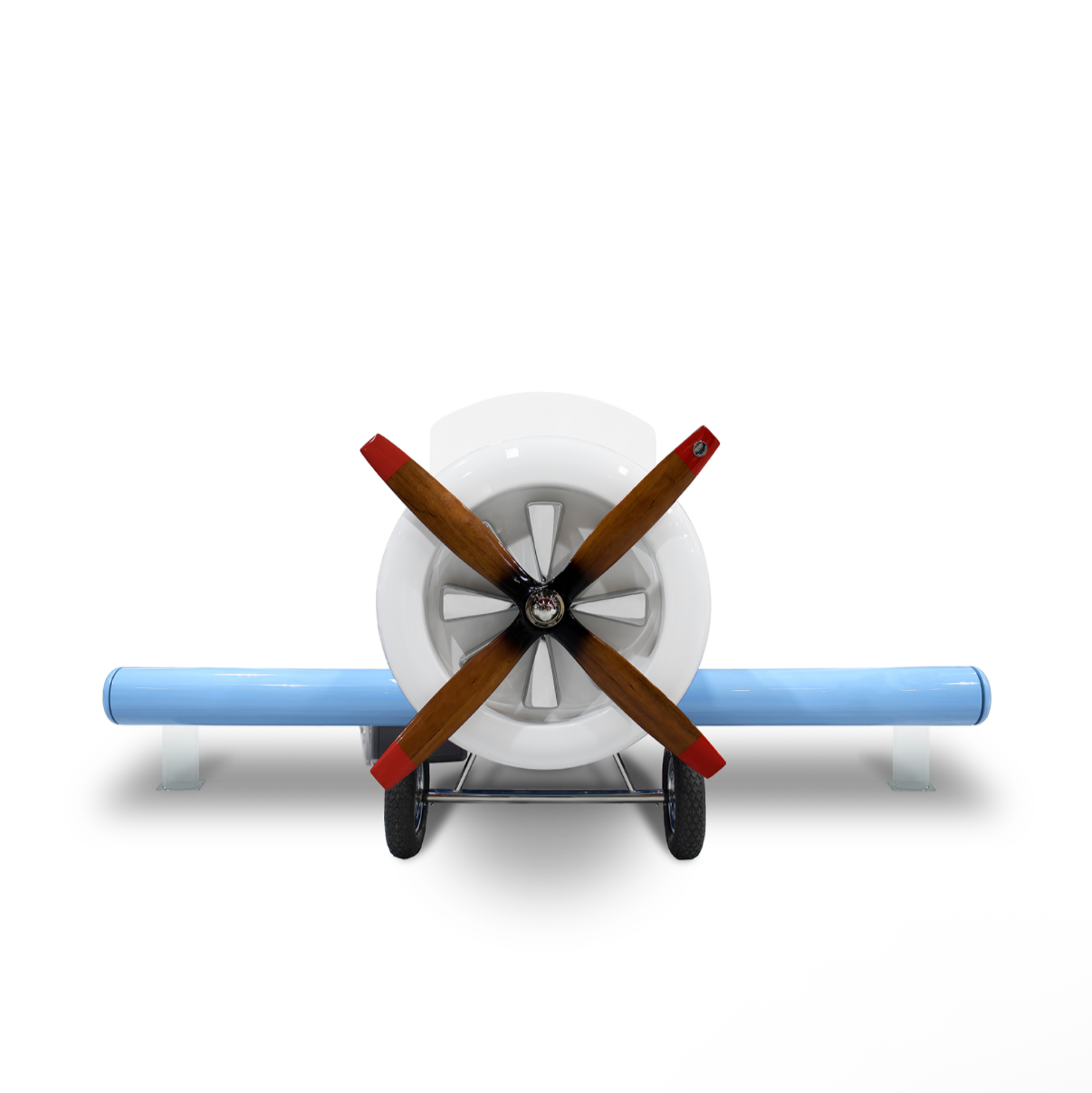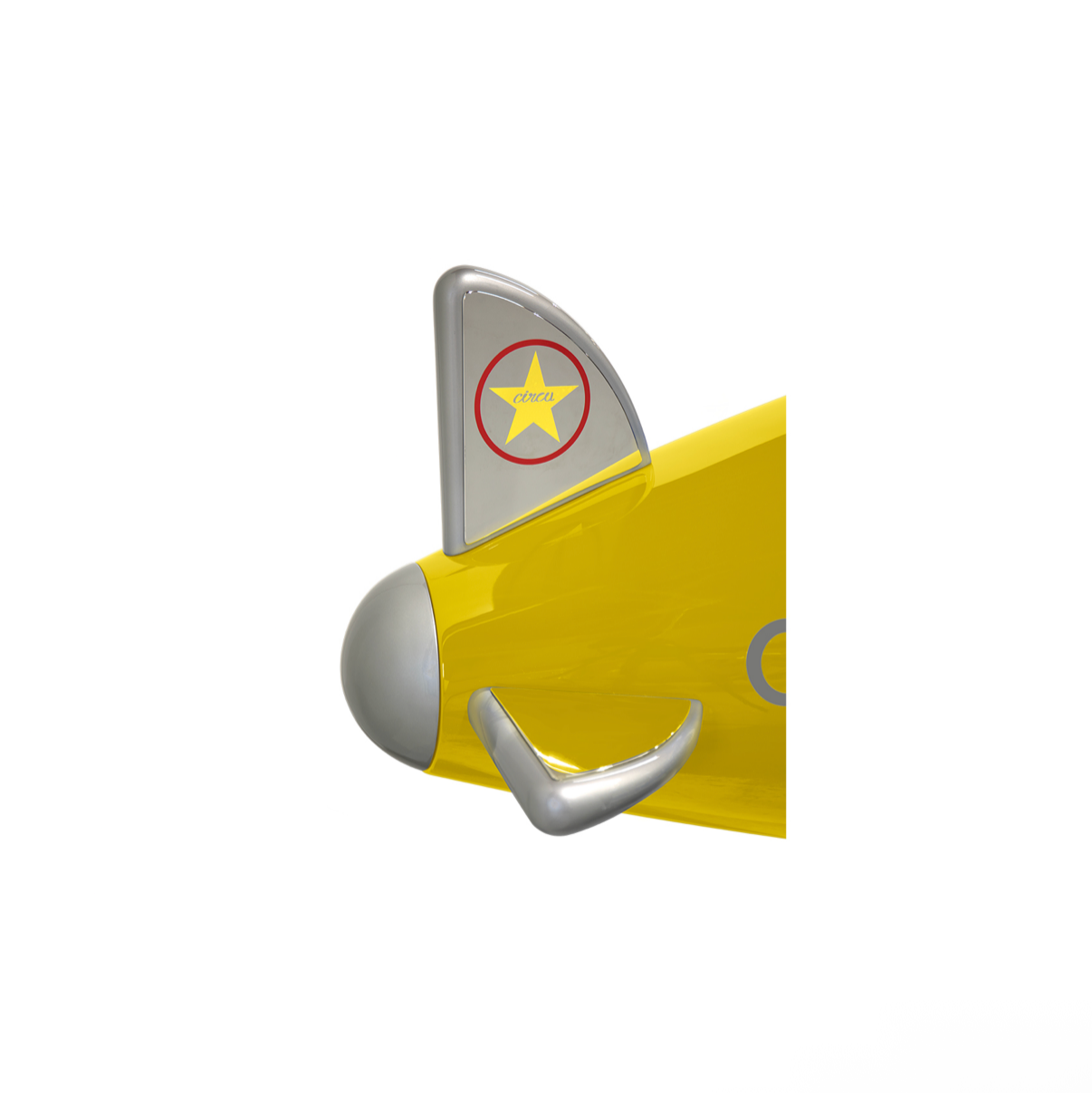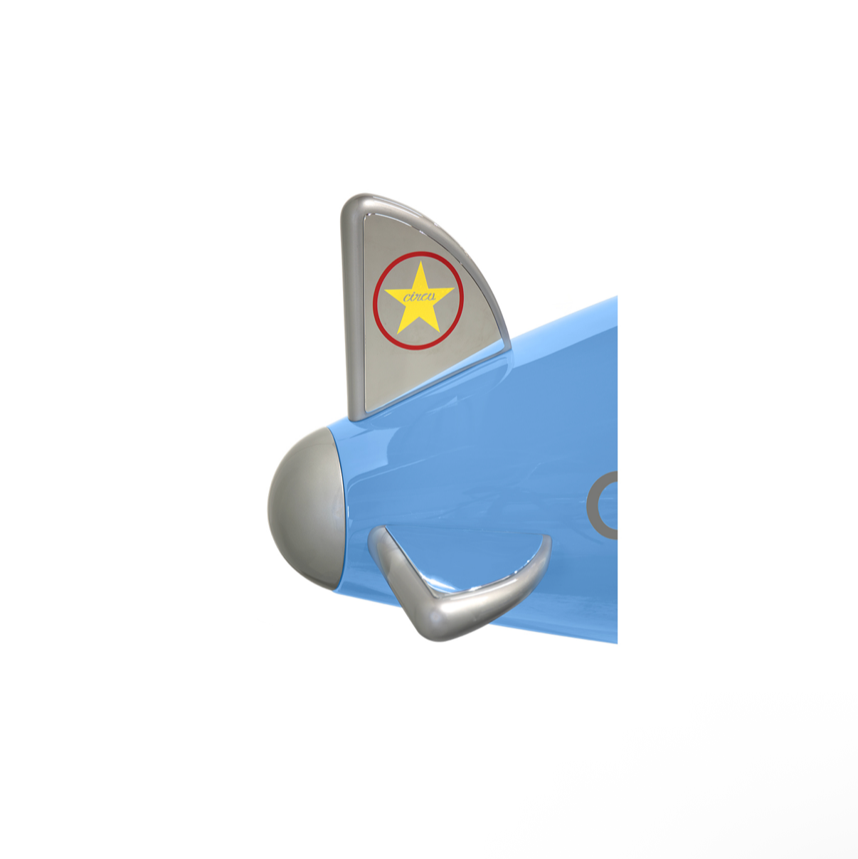 The body is entirely made of fiberglass with glossy varnish applied and chrome plated finishes in the engine and wheels. The decorative suitcases include secret storage compartments and allow easy access to the bed. The Sky One Plane makes the crib-to-bed transition as painless as possible.