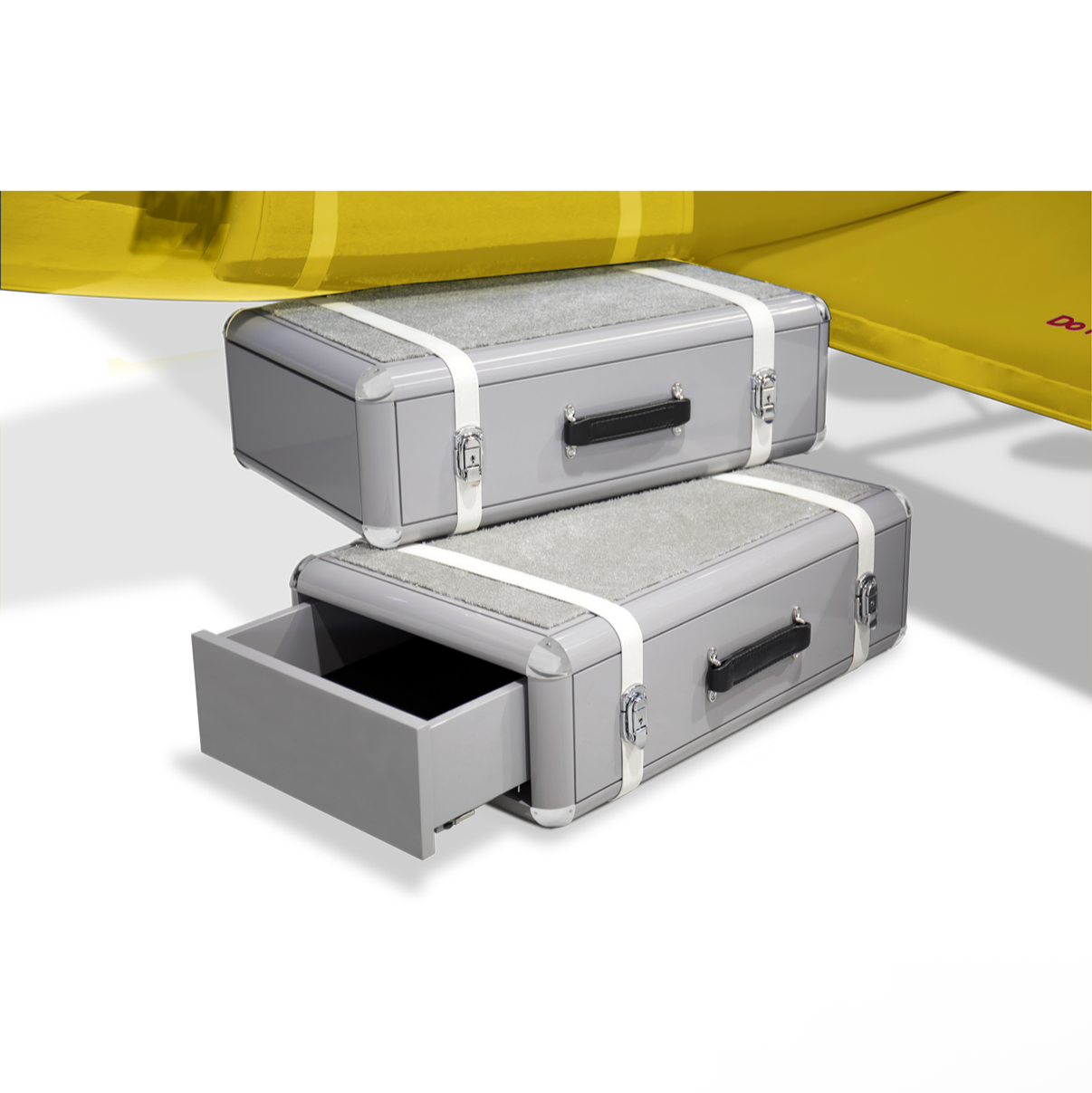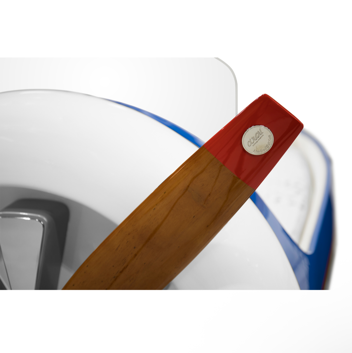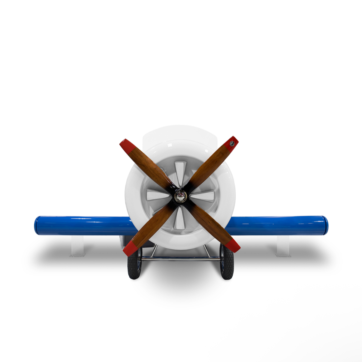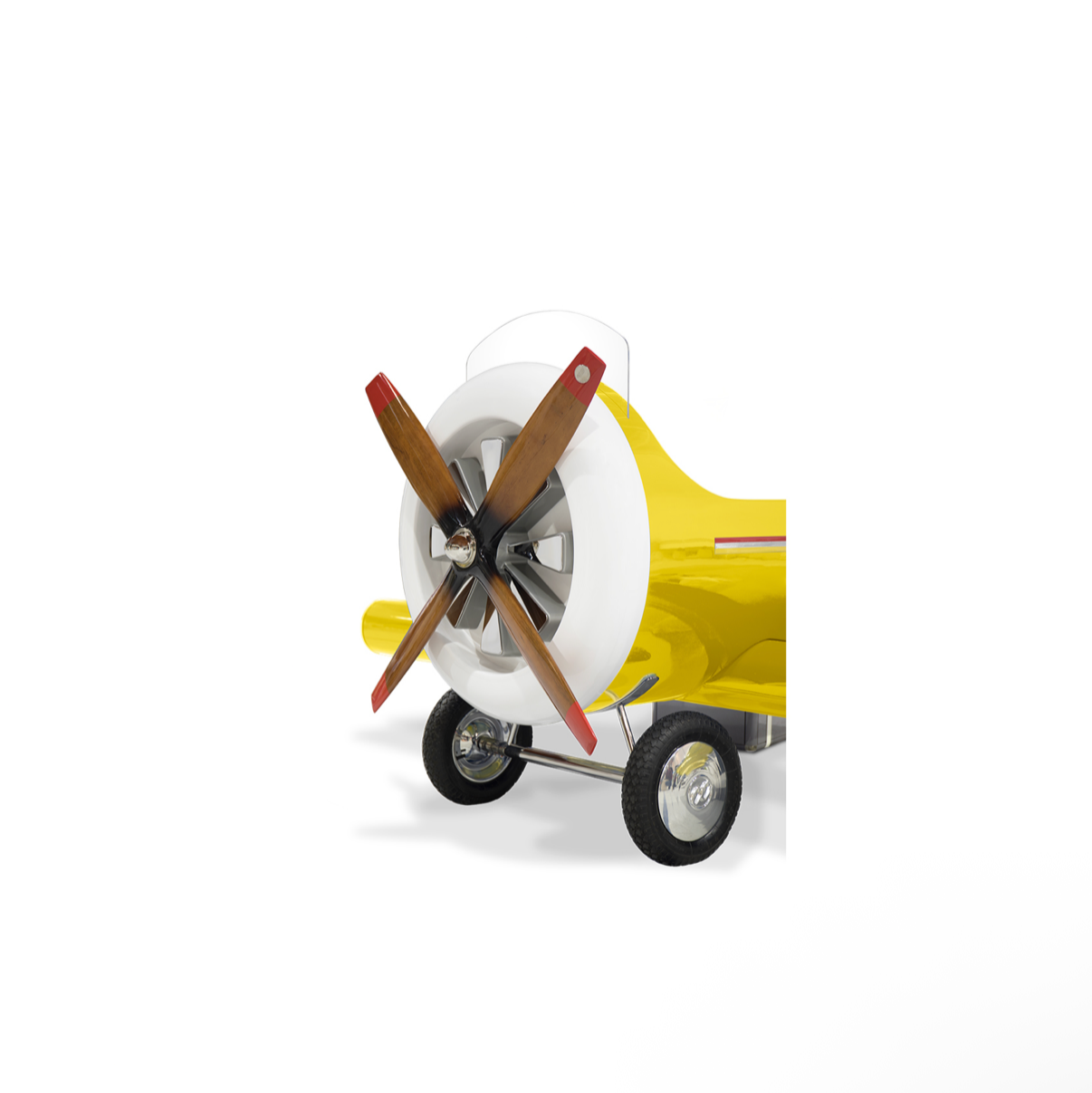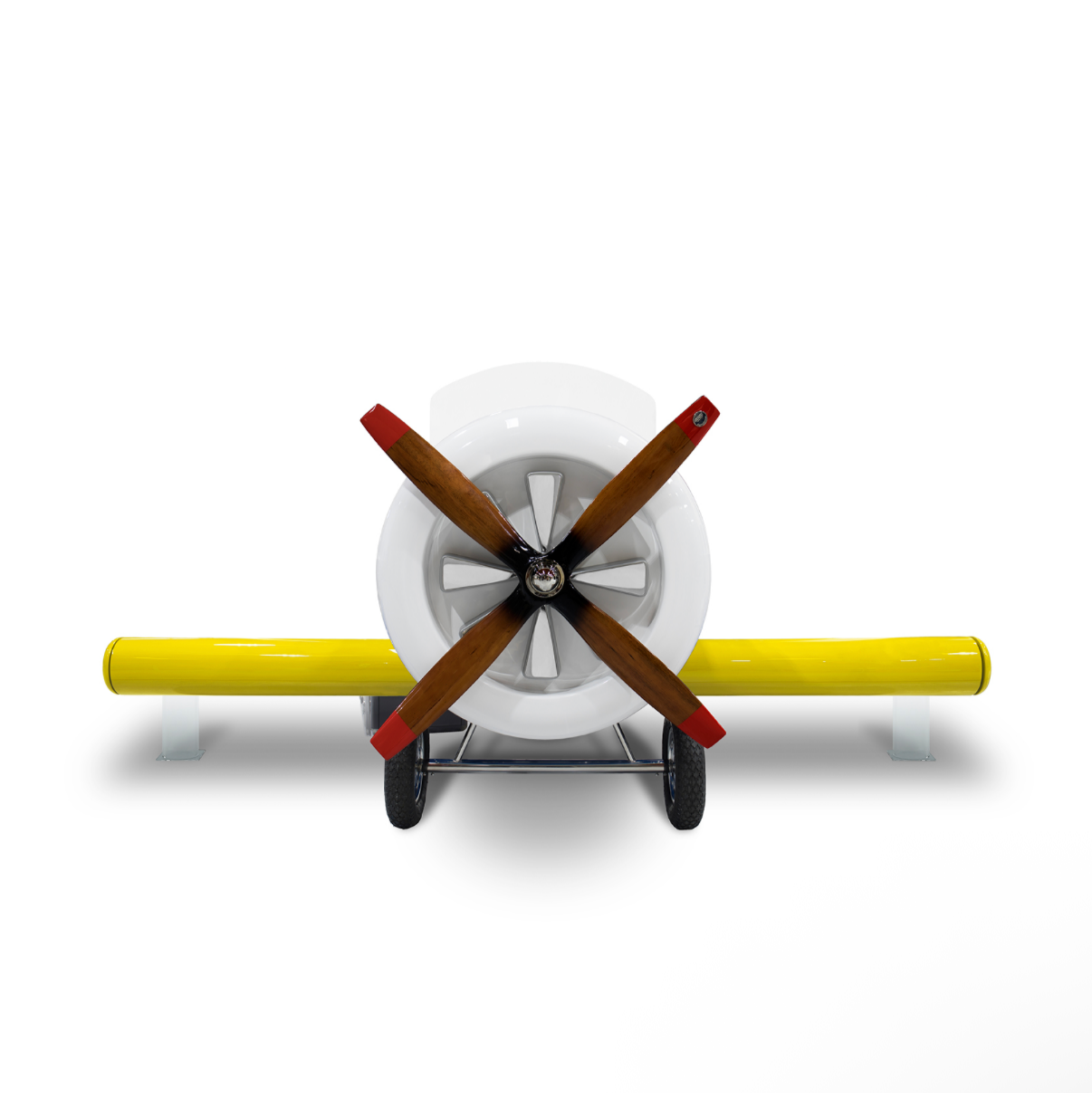 The body is entirely made of fiberglass with glossy varnish applied and chrome plated finishes in the engine and wheels. The decorative suitcases include secret storage compartments and allow easy access to the bed. The Sky One Plane makes the crib-to-bed transition as painless as possible.