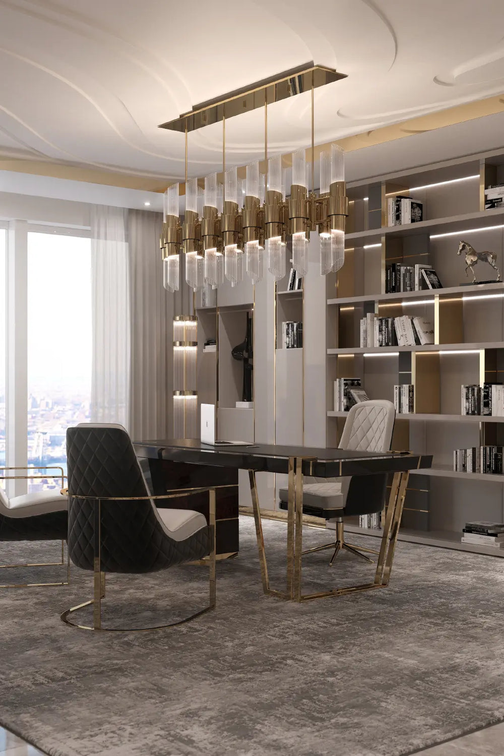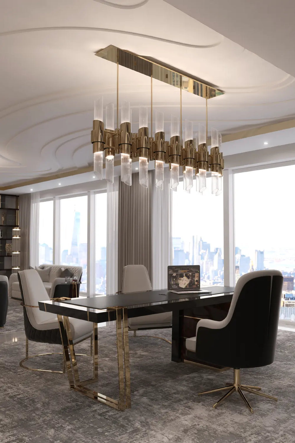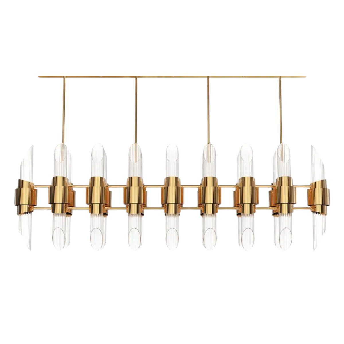 Inspired by the mesmerizing reflections seen through a planetarium’s lens, the Tycho Rectangular Suspension Lamp embodies both architectural strength and celestial beauty. Featuring a precise structure of gold-plated brass paired with ribbed crystal glass, this suspension piece captures and diffuses light with sublime elegance. Ideal for dining areas, boardrooms, or luxury hospitality interiors, it adds a touch of futuristic refinement to any elongated setting.