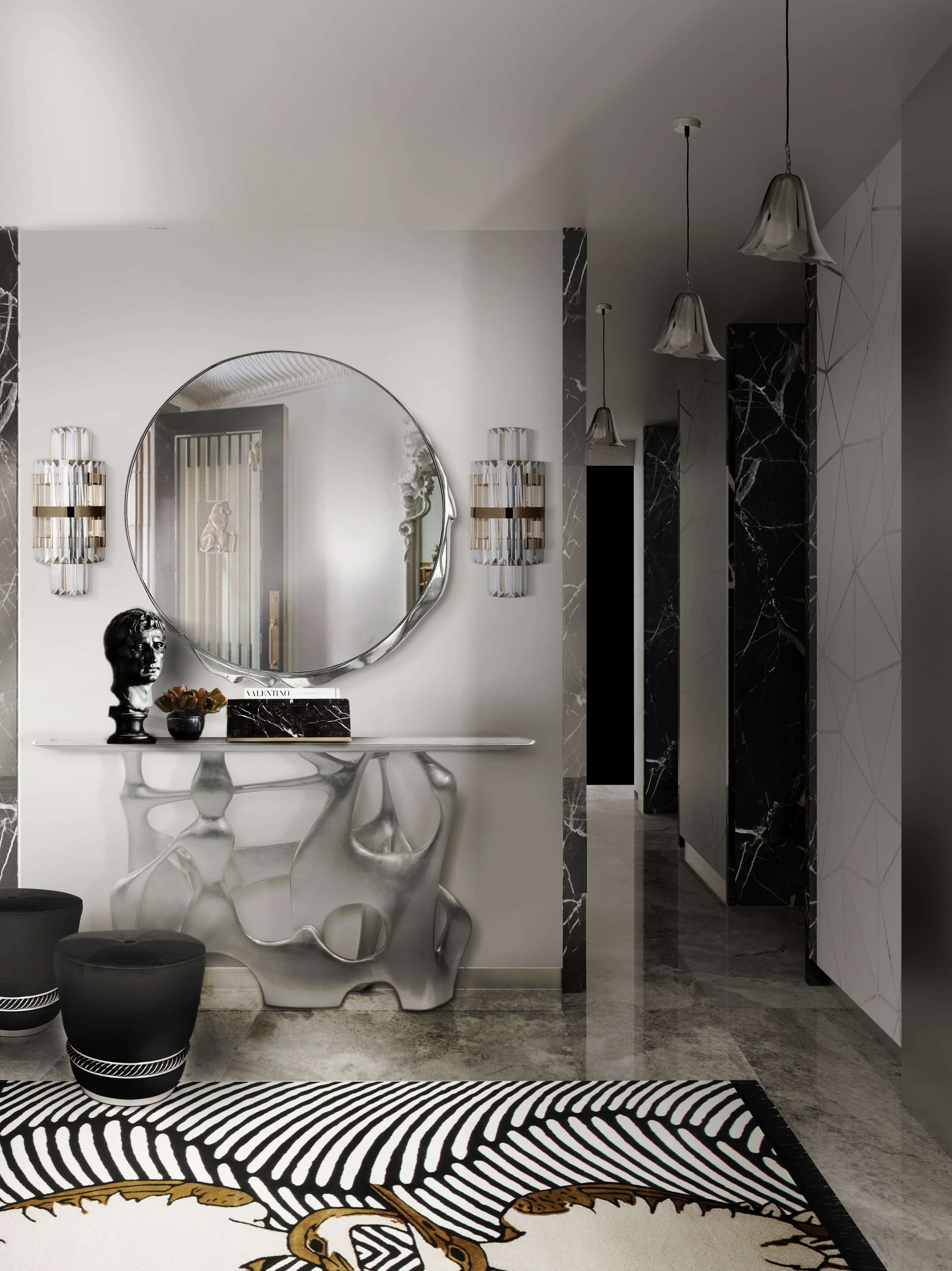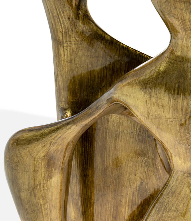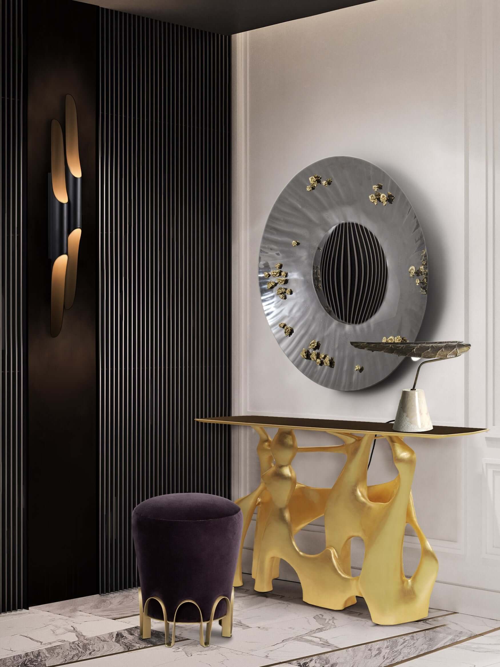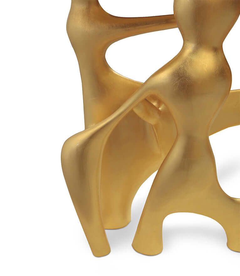 The Bastei Console has a structure in glossy gold leaf with a tabletop in glossy walnut root veneer that will bring a distinguished elegance into your modern home decor. Inspired by one of the most famous rock formations in Germany, this modern gold console table will be the final item in your modern home design.