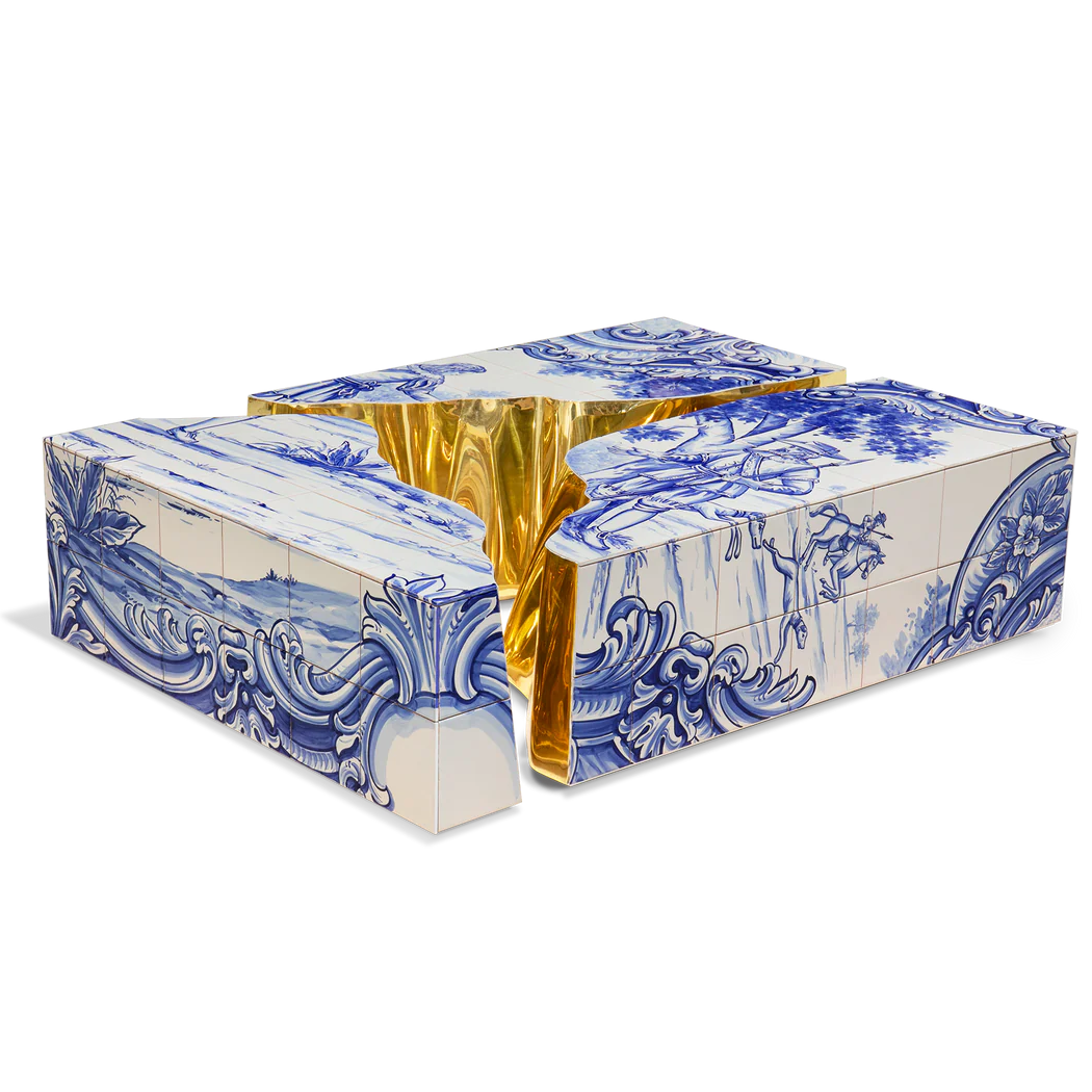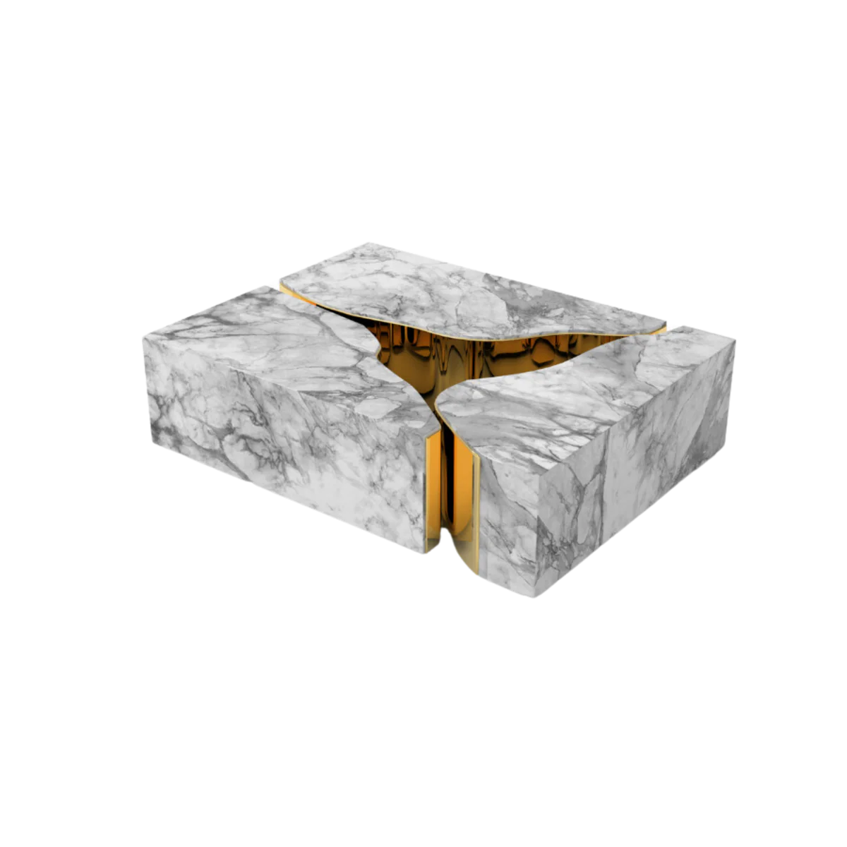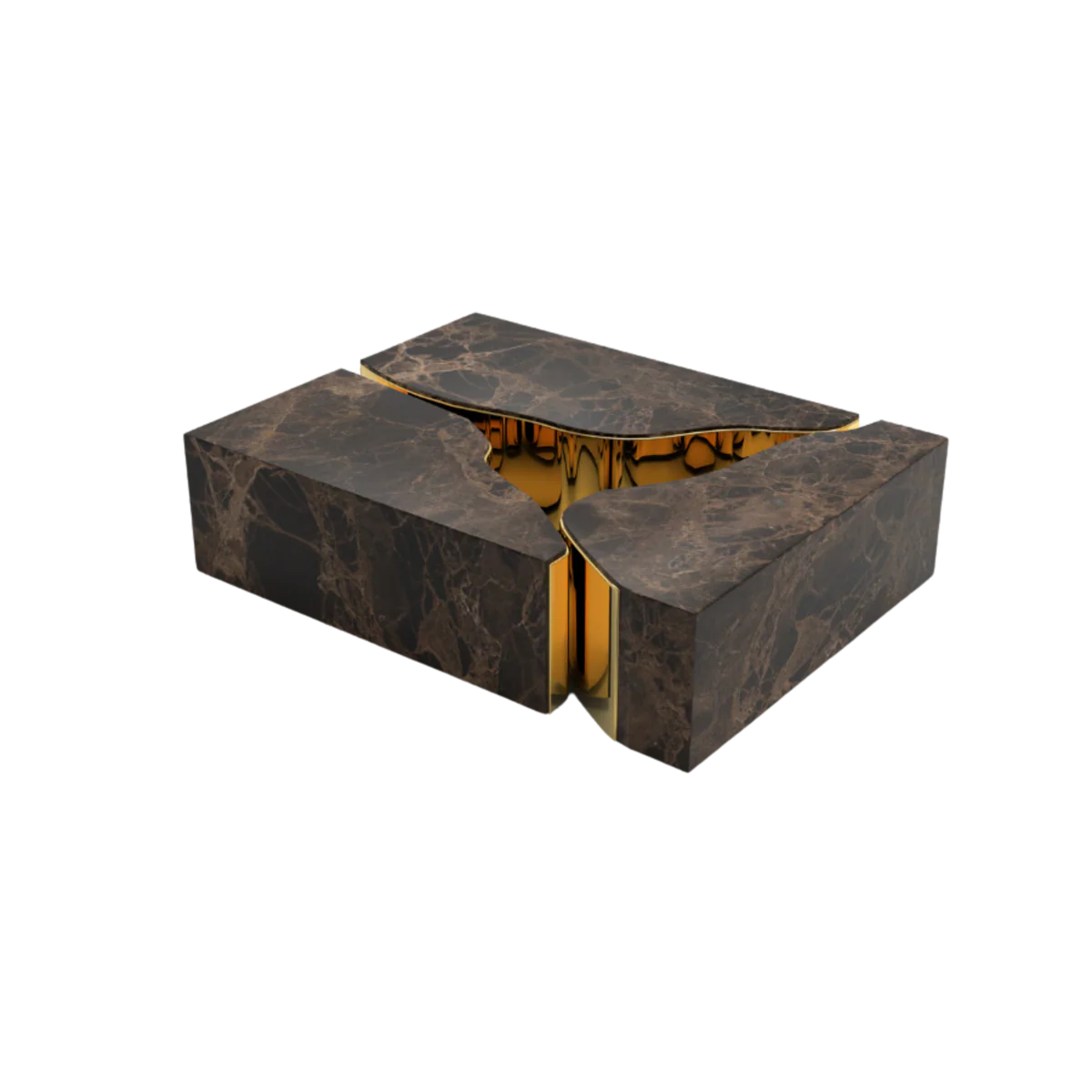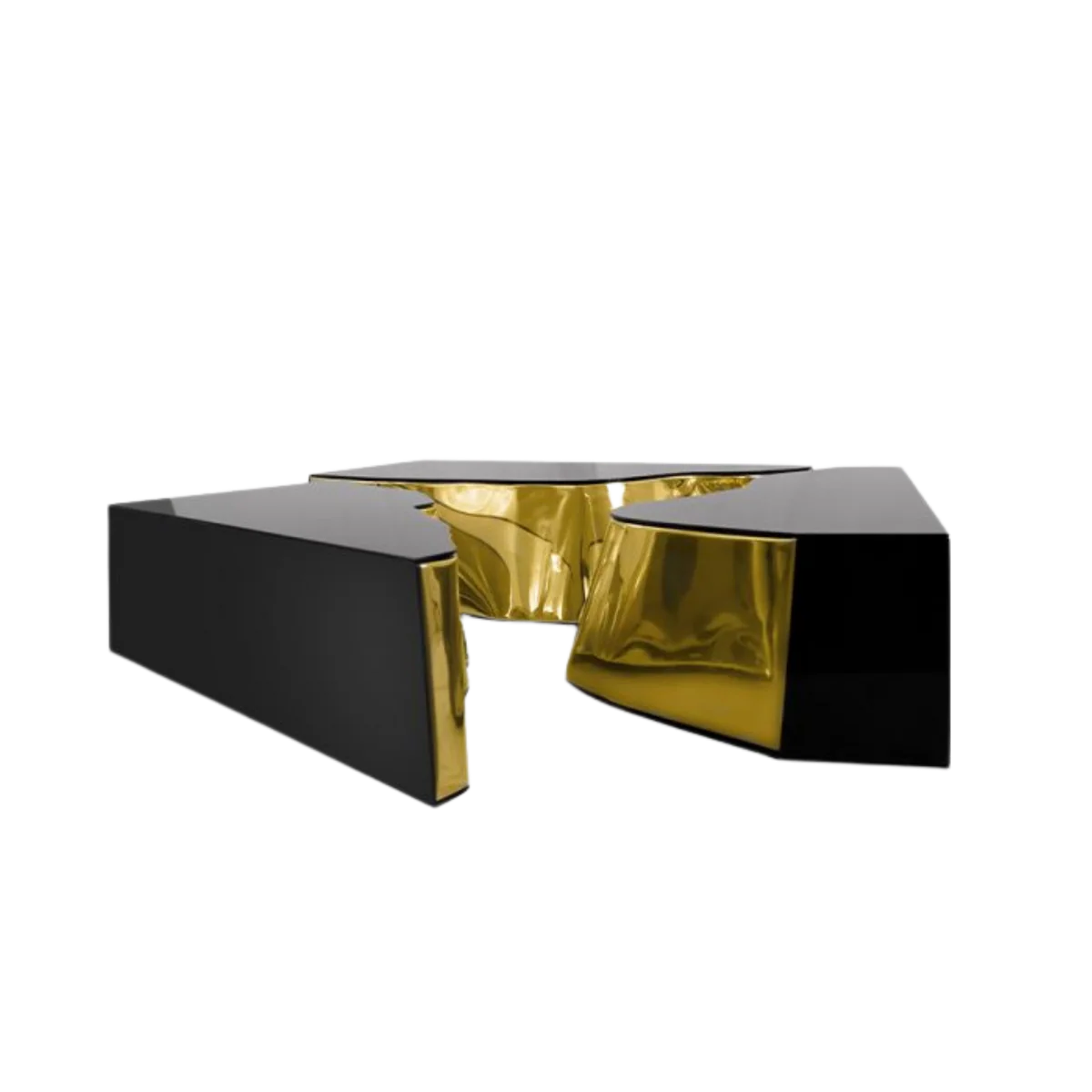 Lapiaz Center Table by Boca Do Lobo, is inspired by the typical karst formations produced by surface dissolution of limestone or dolomite rocks. It can also be caused by freezing and thawing in cold climates. This is how Lapiaz luxury coffee table emerged. Imagine a stone frozen and freshly cracked to show the entire world a rich, golden interior. The polished brass details and mirrored sides attribute this luxury design artwork an artic yet comfy and warm beauty. Definitely a statement piece for the most luxurious interior designs.