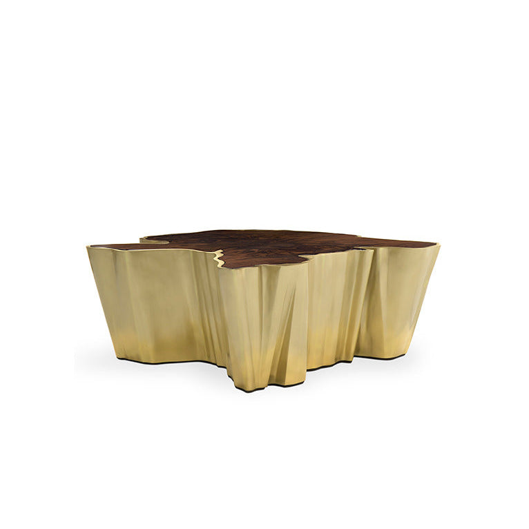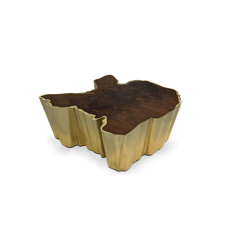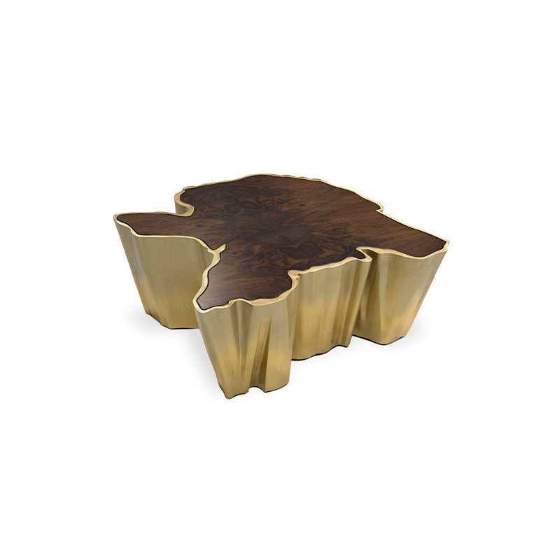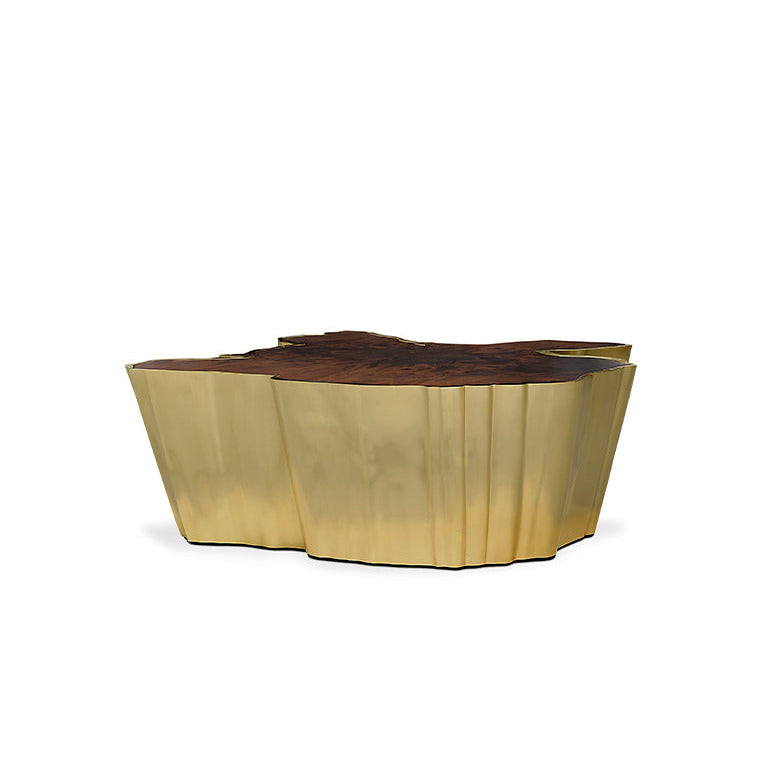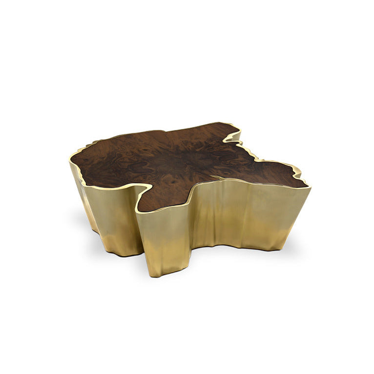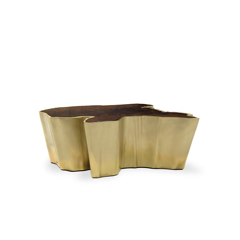 The Sequoia Coffee Table has a tabletop in walnut root veneer with a structure in glossy brushed casted brass with an aged patina. Inspired by the sequoia trees, one of the largest and tallest trees in the world, this modern contemporary coffee table is elegant and nature personified. Bring a little bit of nature into your modern interior design with this coffee table.