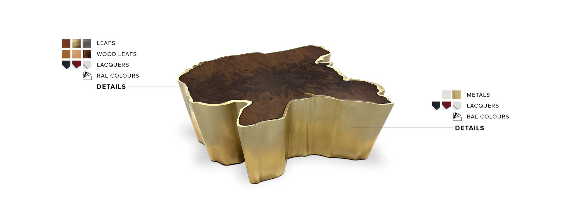 Sequoia is one of the largest and tallest trees in the world that grows in California. Just like it, SEQUOIA Center Table is a force of Nature. The distinct walnut root veneer top shows the passage of years and the base in brass with aged patina adds a refined touch. This modern centre table proves the beauty of the action of time.