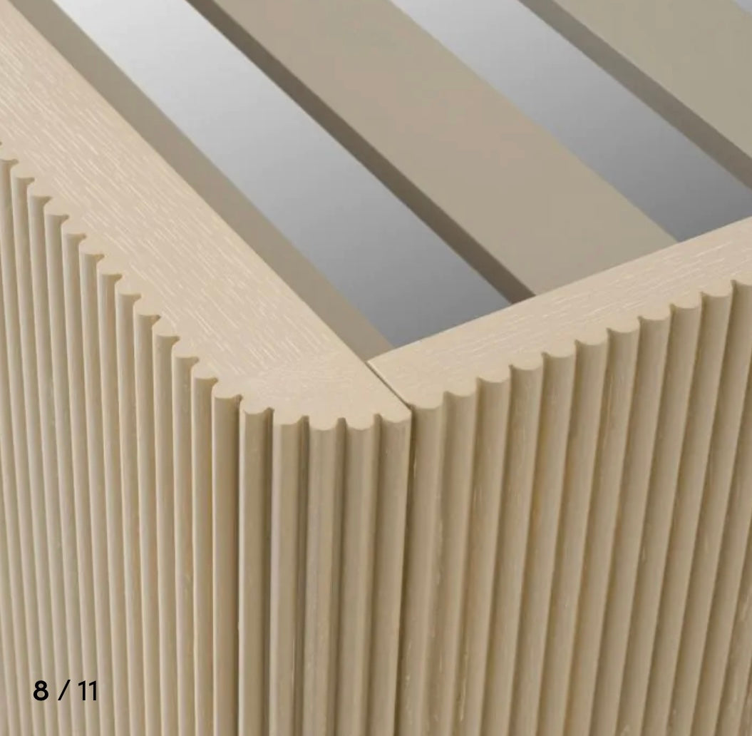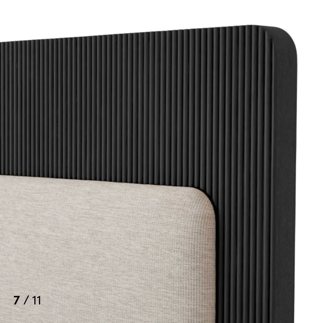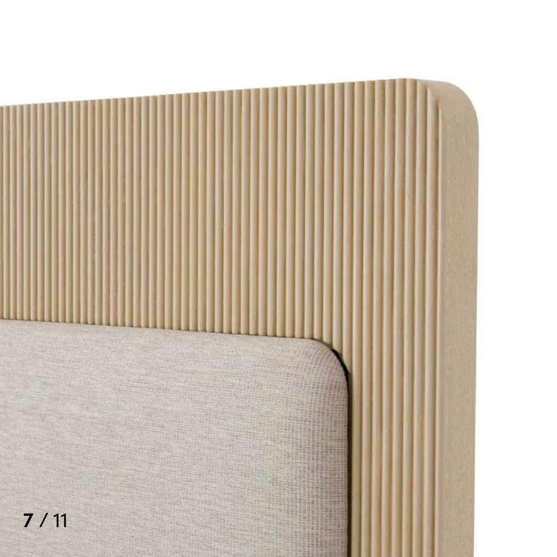 The Dimitrios bed frame features ribbed solid wood in a light color, complemented by natural Durini fabric.