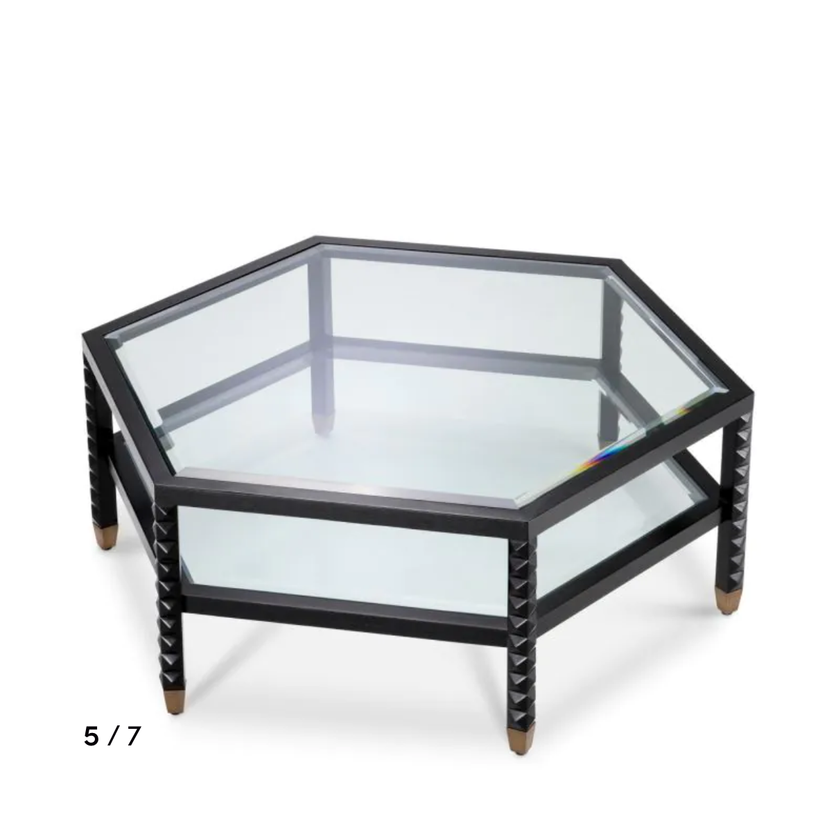 The Cornelius Coffee Table captivates with its classic black finish and elegantly studded legs adorned with antique brass feet.
