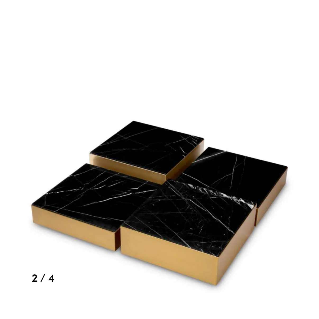 Different levels make this 4-piece configuration surprisingly versatile. The 2 low and 2 high elements can be grouped together to form a large coffee table or used as individual accent tables. Mounted on a sturdy black base, each piece has brushed brass sides and a top of black marble.