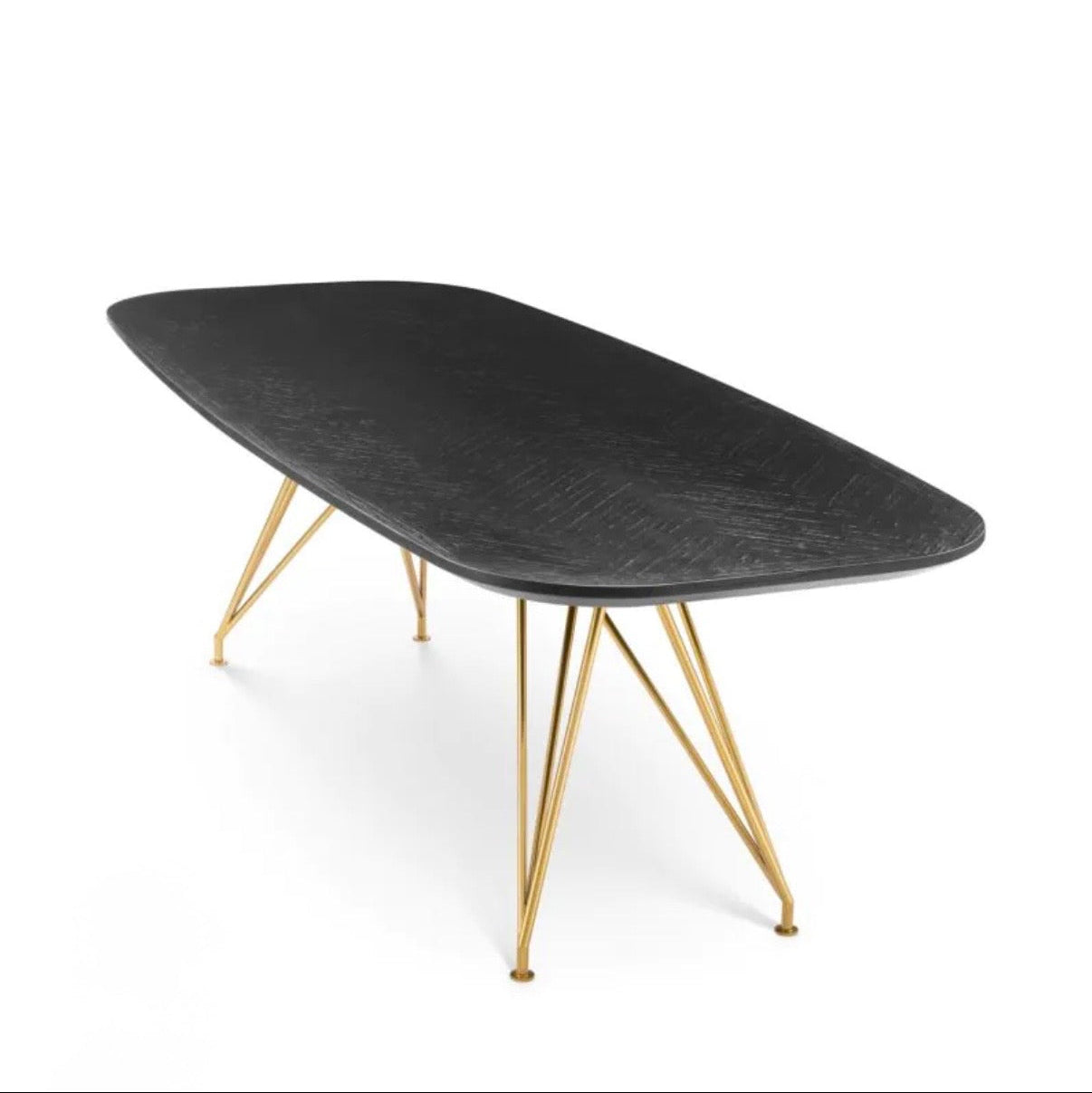 Crafted with meticulous artistry, this table features a charcoal oak veneer that exudes a captivating depth and richness. The brushed brass finish legs add a touch of opulence, accentuating the table's unique aesthetic. Whether hosting intimate gatherings or lavish feasts, Dining Table Levante will soon become the focal point of your dining space.