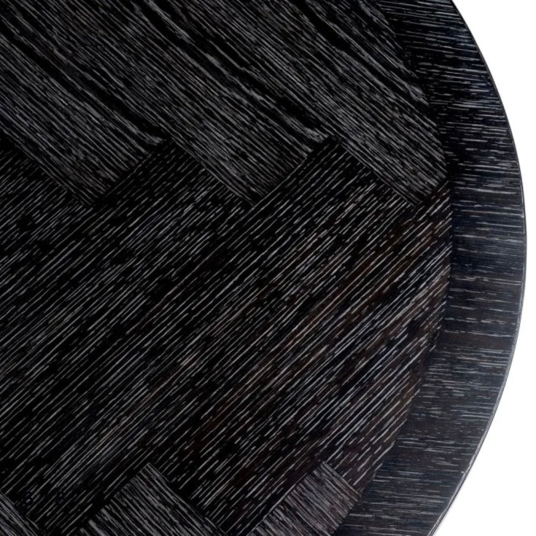 Give your décor Mid-Century Modern appeal with the stunning charcoal oak veneered Melchior Dining Table that features a sturdy base with a bronze finish.
