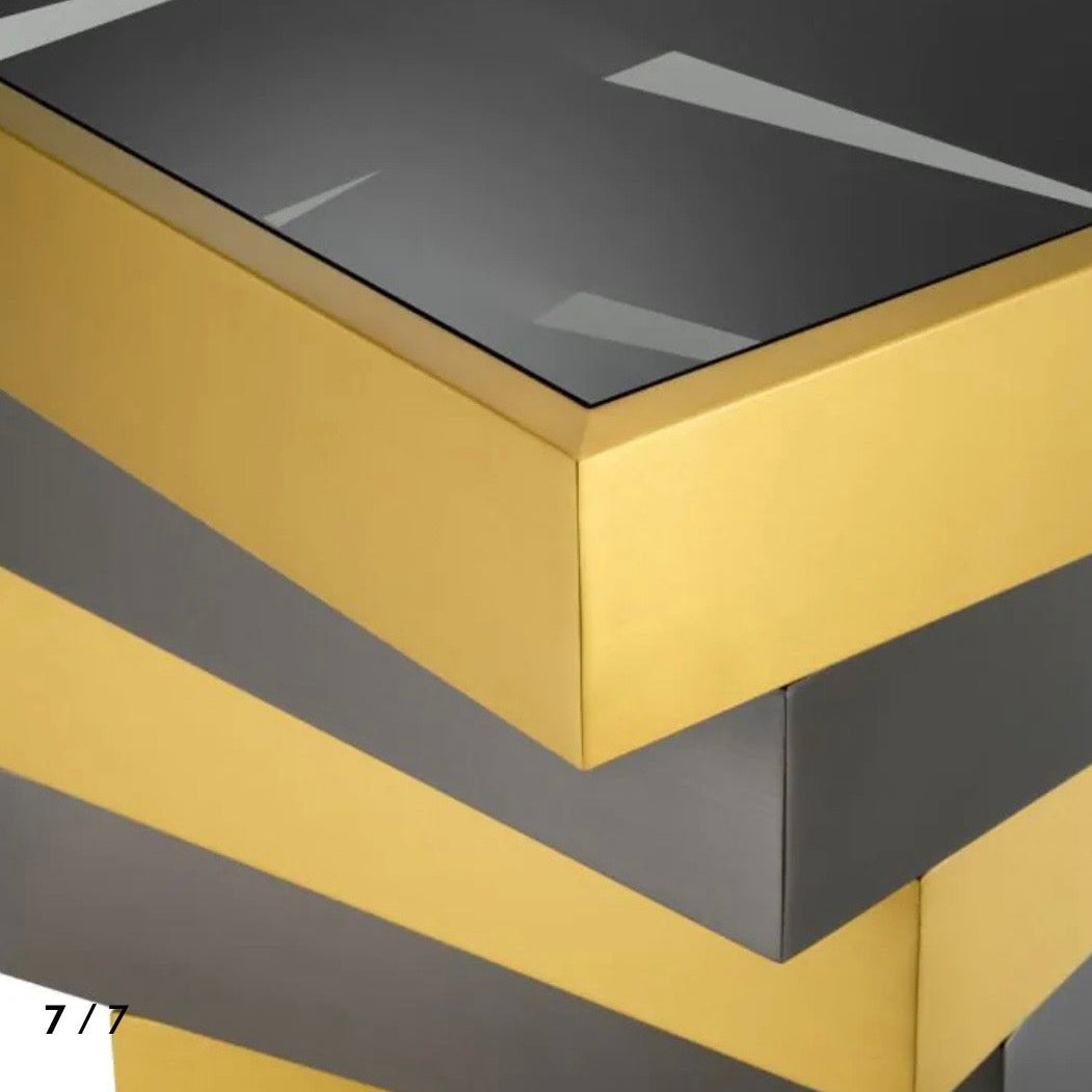 The Zamora Side Table features a brushed brass finish paired with a smoked glass top, combining metallic warmth with translucent depth.
