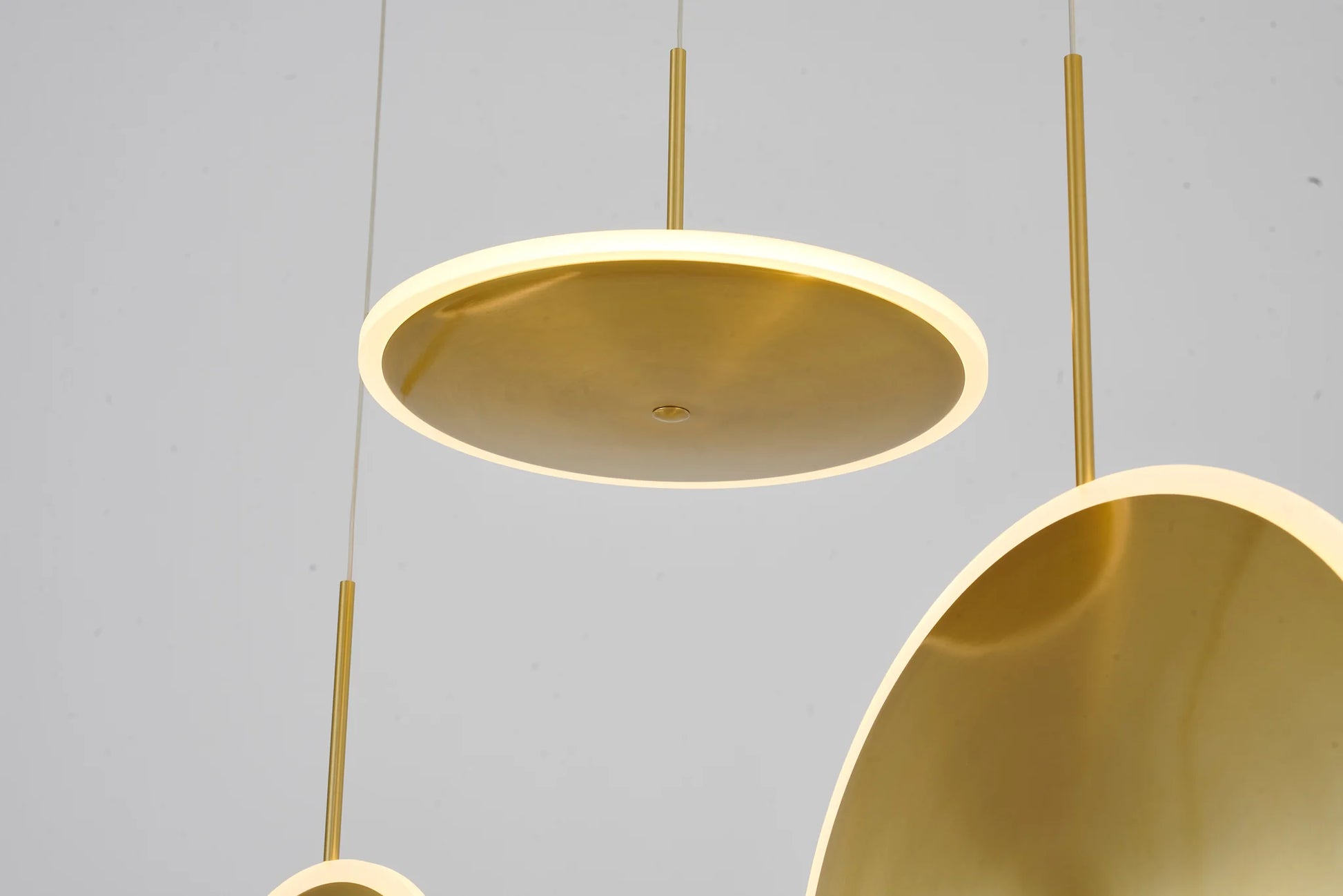Elevate your space with the modern elegance of the OC23C59G Gold Frame LED Saucer Chandelier by Bethel International. Featuring six sleek LED saucer lights suspended from a rectangular gold aluminum canopy, this fixture combines minimalist design with warm, ambient lighting. Adjustable cords and dimmable LEDs make it perfect for dining rooms, living areas, or contemporary office spaces.