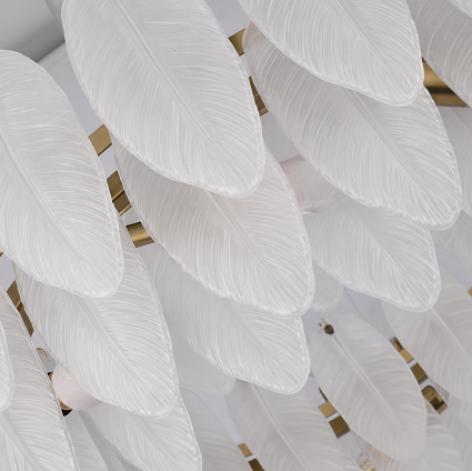 Round Brass Frame Chandelier With Hanging Frosted White Glass Leafs