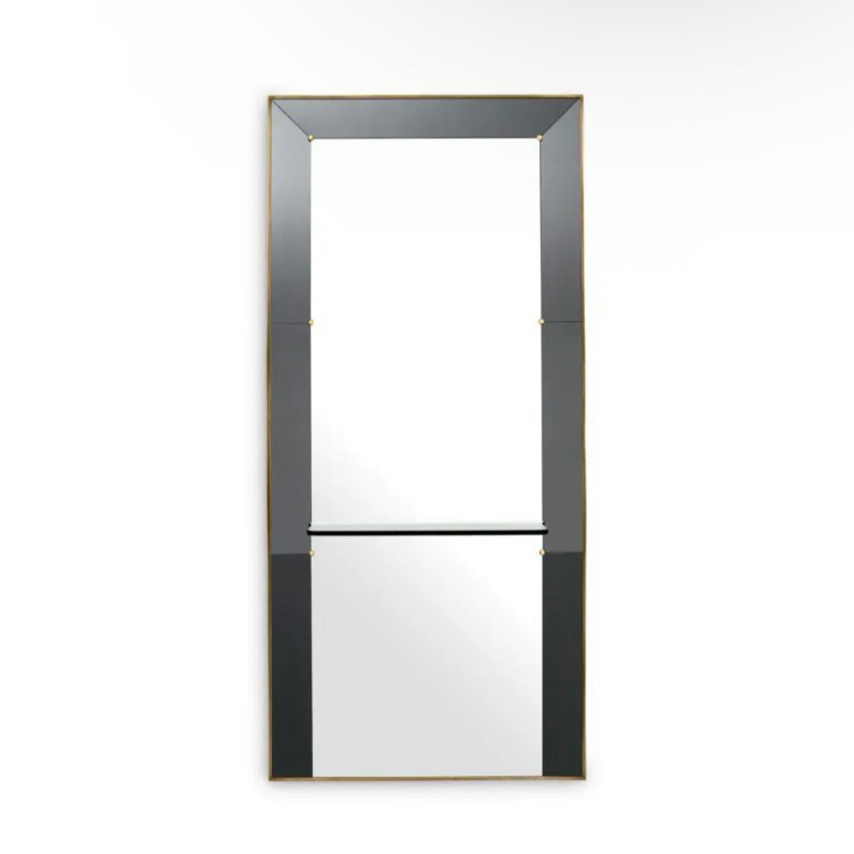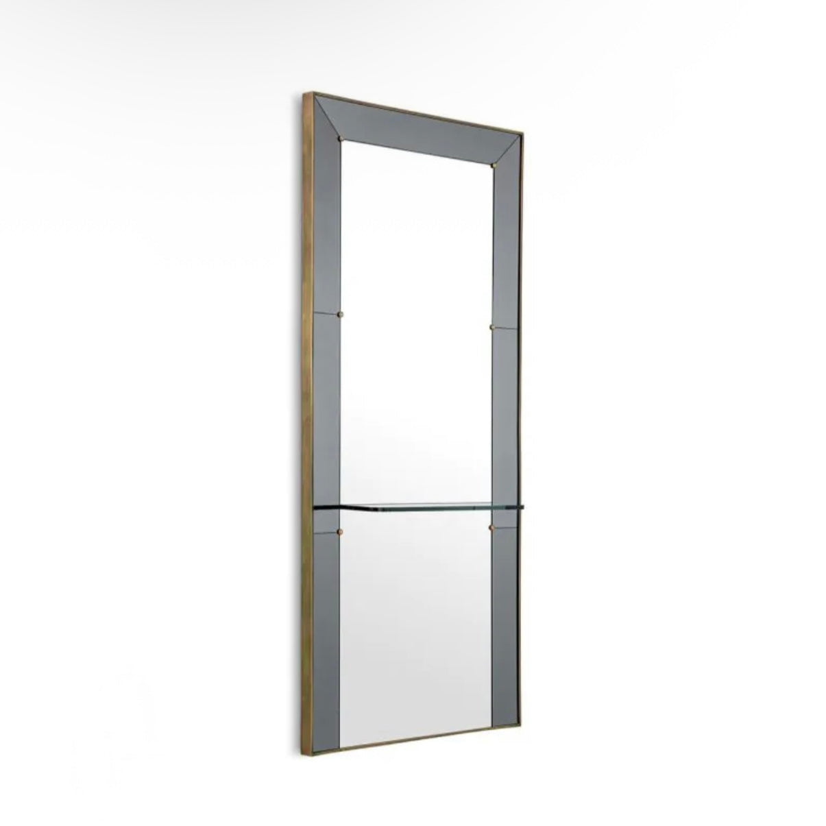 Elevate your hallway or dressing area with the Mirror Bellana by Eichholtz—a sophisticated full-length wall mirror designed for both elegance and utility. Framed in smoked mirror glass with an antique brass finish, this luxurious piece is more than just reflective—it’s functional. A sleek clear glass shelf offers space for your favorite decorative accents or daily beauty essentials, making it ideal for modern living.