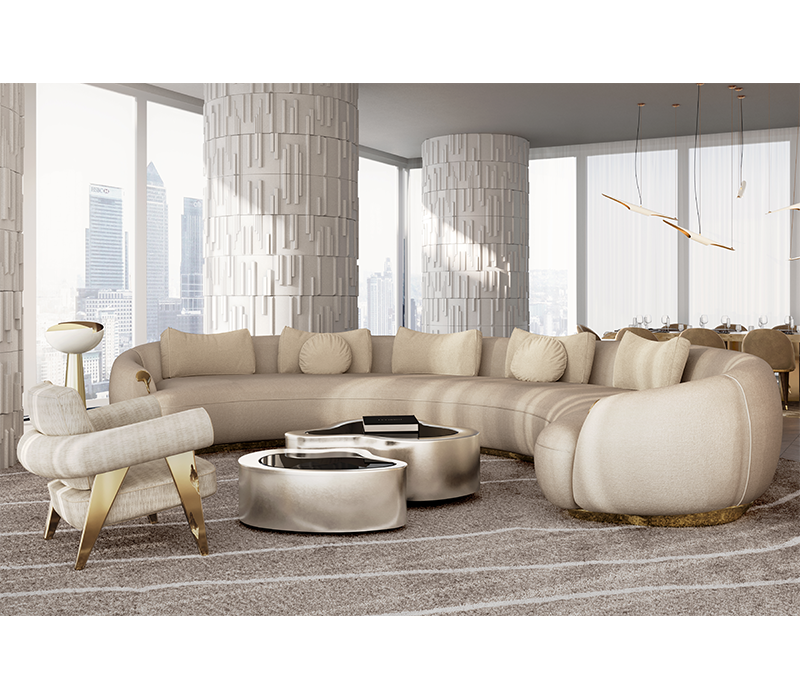 Inspired by the spirit and mission of the famous Cirque de Soleil, the Soleil Curved Sofa is a synthesis of styles and senses. Proving that its playful lines can also translate to absolute sophistication, this elegant curved sofa with creamy upholstery embrace a perfect combination between a vintage and a contemporary design to provide a sumptuous option for any modern day room. It features a double-part configuration that offers a multitude of seating without interrupting the flow of the space with individual punctuations. The brass details also perfectly complement the elegant lines of this timeless piece.
