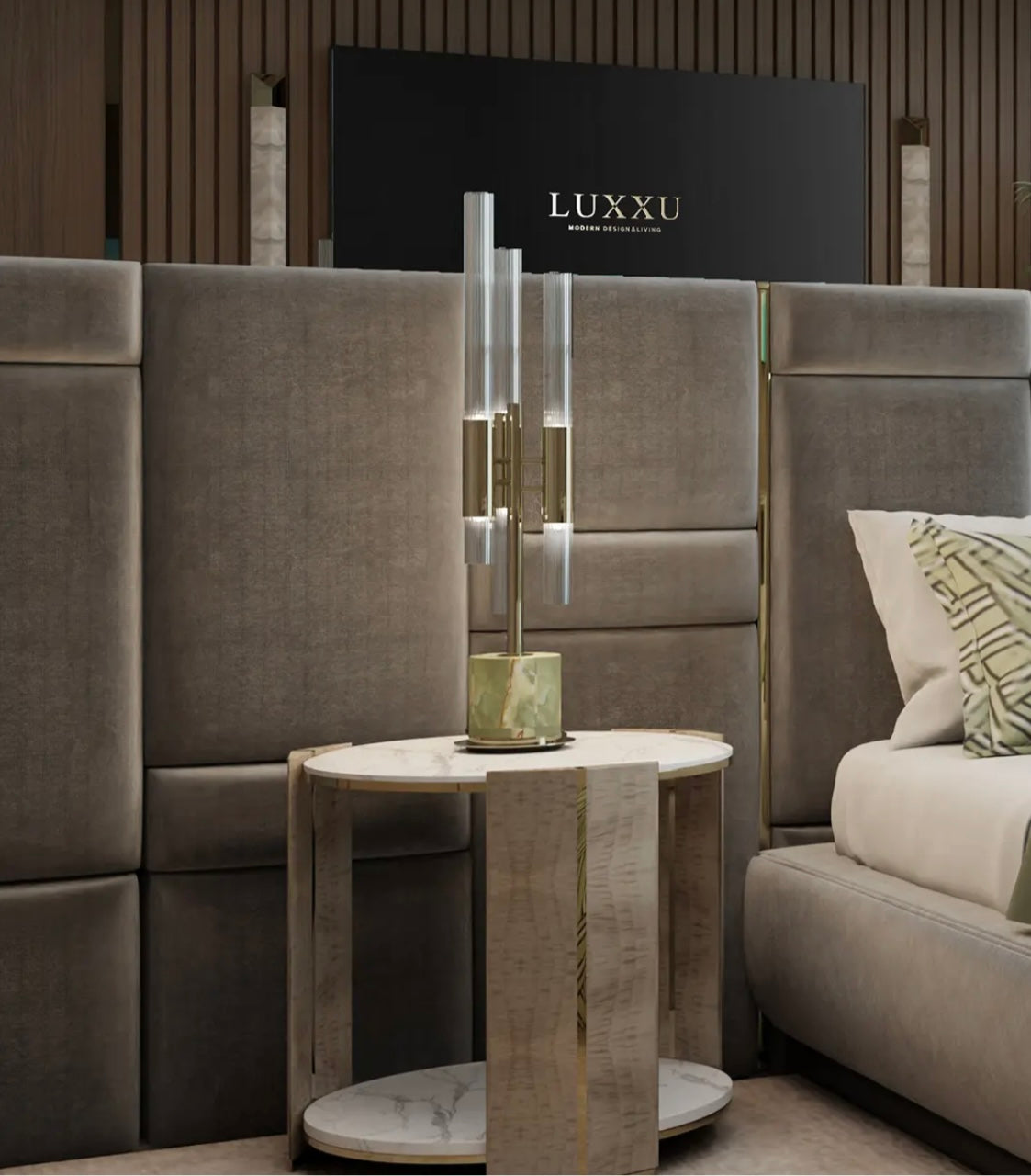 The Waterfall Table Lamp is a unique lighting piece with delicate tubes of handmade crystal glass embraced by gold-plated brass. The base made of Emperador marble only makes this design more stylish and perfect for modern bedroom lighting or office decor.