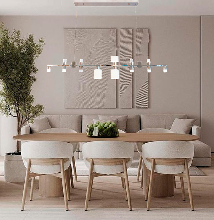 The RS01C60BLK LED Chandelier is a transitional lighting fixture that combines sleek black metal with glass shades for a modern yet versatile design. With 13 integrated LED lights, this chandelier provides bright and customizable illumination with selectable color temperatures of 3000K, 4000K, or 5000K. Its elongated 60-inch frame and adjustable 72-inch cord make it perfect for over dining tables, in living rooms, or as a statement piece in bedrooms.