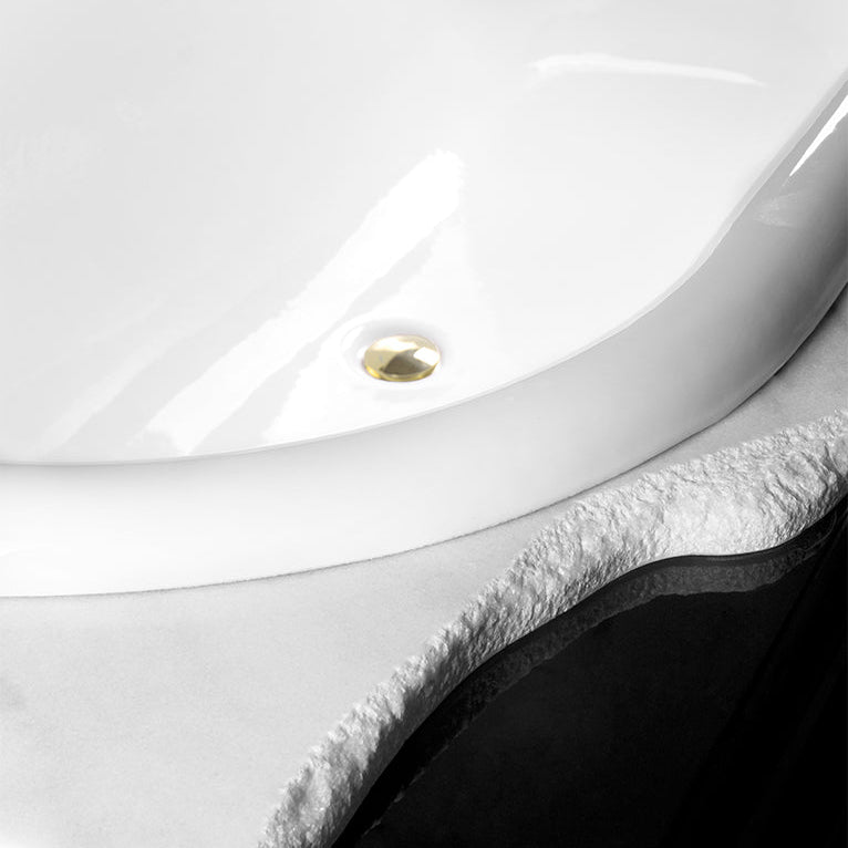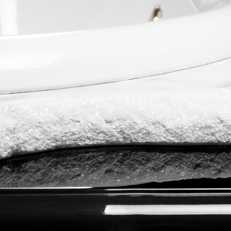 Structure: High gloss black lacquered wood; Top: Hand-worked white Ibiza Marble; Tub: White enamel Cast Iron; Water drainage: Floor