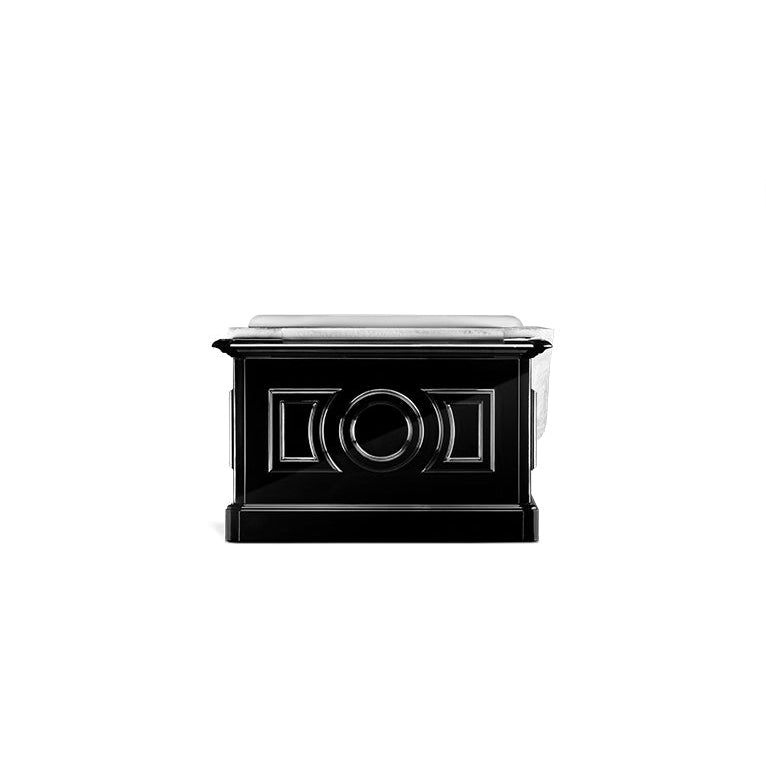 The Petra Bathtub combining Ibiza marble and wood, and inspired by the ancient city of Petra, where buildings are built into magnificent cliff stones. The black gloss shine of the wood matches the incredibly beautiful different shades of white of the marble, turning this item into an everlasting luxuriously unique visual experience for your bathroom design.