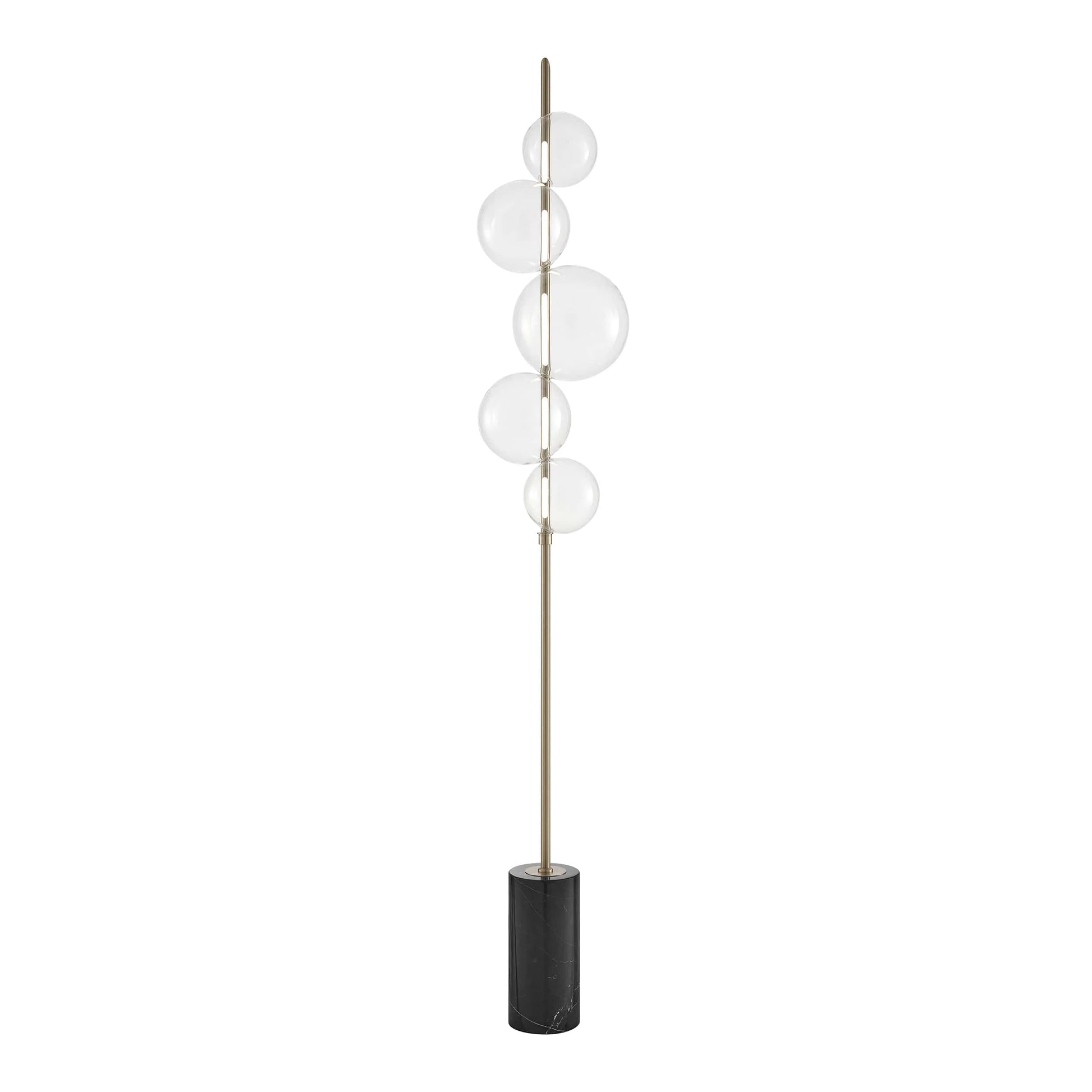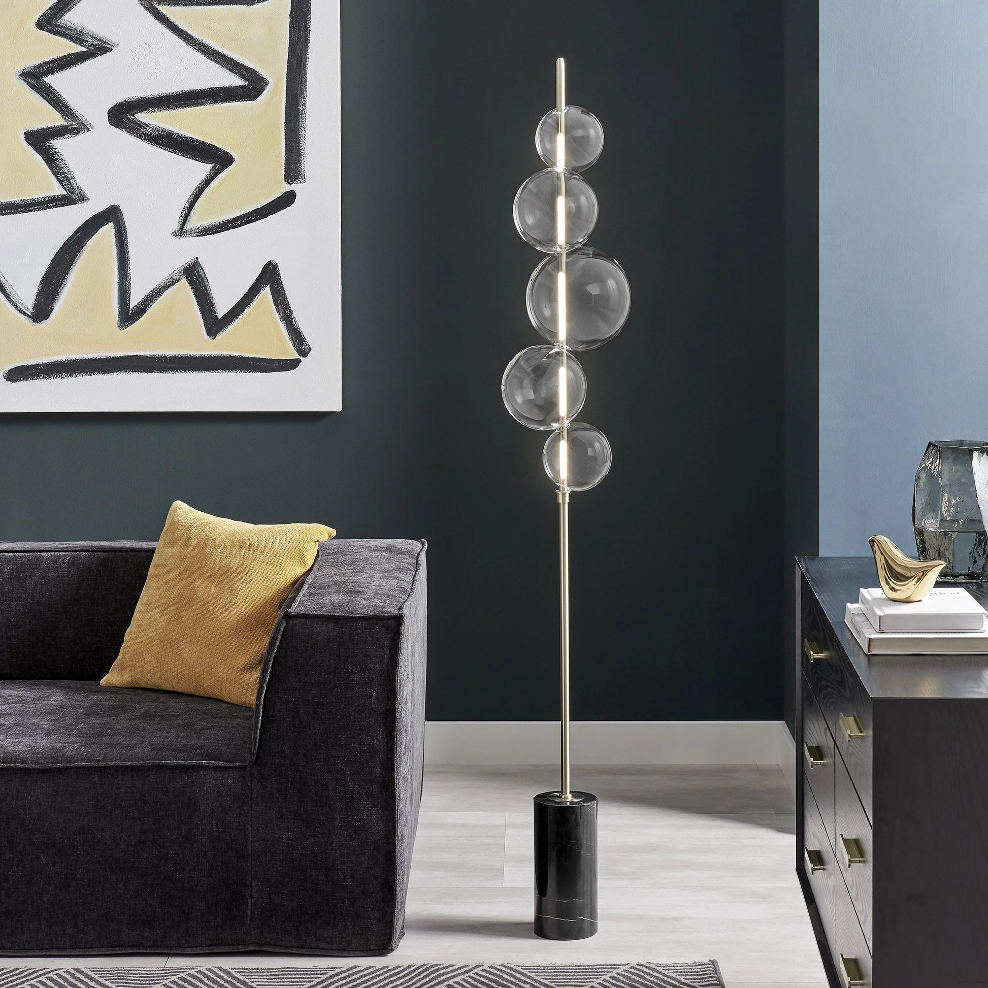 Sleek, sculptural, and sophisticated, the Aluminum and Glass Floor Lamp in Satin Nickel is a true conversation piece for modern interiors. This tall floor lamp features a vertical row of six glass globe shades that appear to float around a slender satin nickel-finished rod, anchored by a solid black marble base. Its integrated LED lighting with CCT technology allows adjustable color temperatures (3000K/4000K/6000K) for personalized ambiance, while the dimmable design offers added versatility. Ideal for living rooms, lounges, or design-forward office spaces, it combines artful design with functional performance in a bold silhouette.