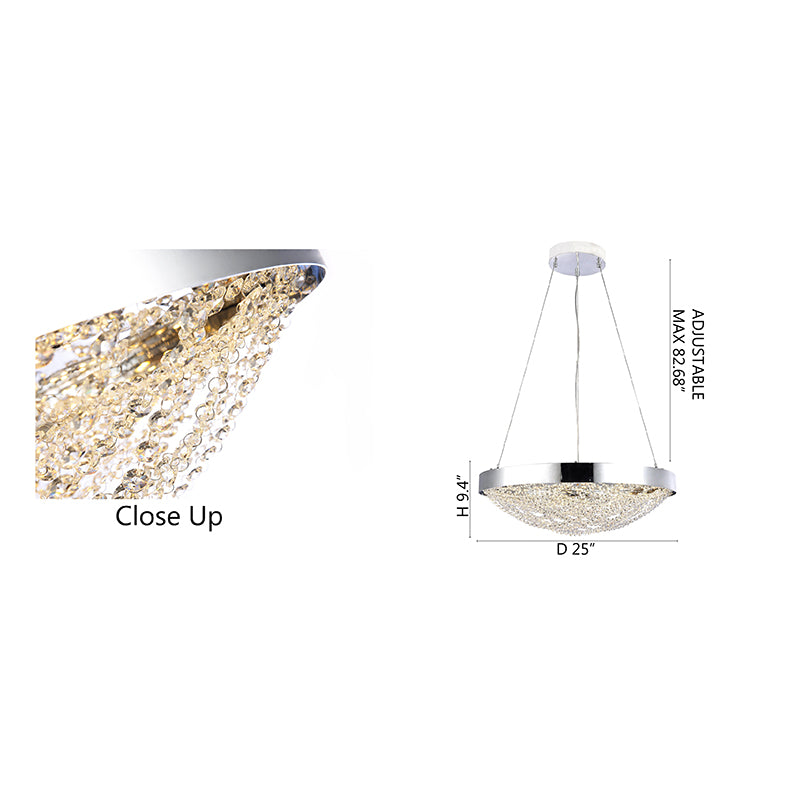Elevate your space with the ZL26C25CH LED Chandelier by Bethel International—a stunning blend of contemporary glam and modern functionality. This eye-catching chandelier features a sleek chrome round metal frame adorned with a basket of clear crystal beads that shimmer and reflect light beautifully.