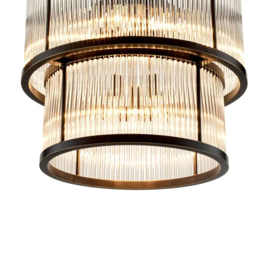 Rectangular Brass Frame Chandelier with Hanging Clear Rippled Glass