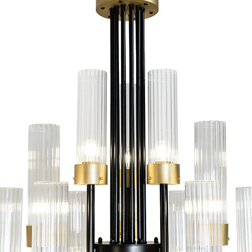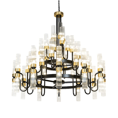 Kahler 54-Light Black & Brass Tiered Chandelier – Fluted Glass Luxury Hotel Lobby Fixture