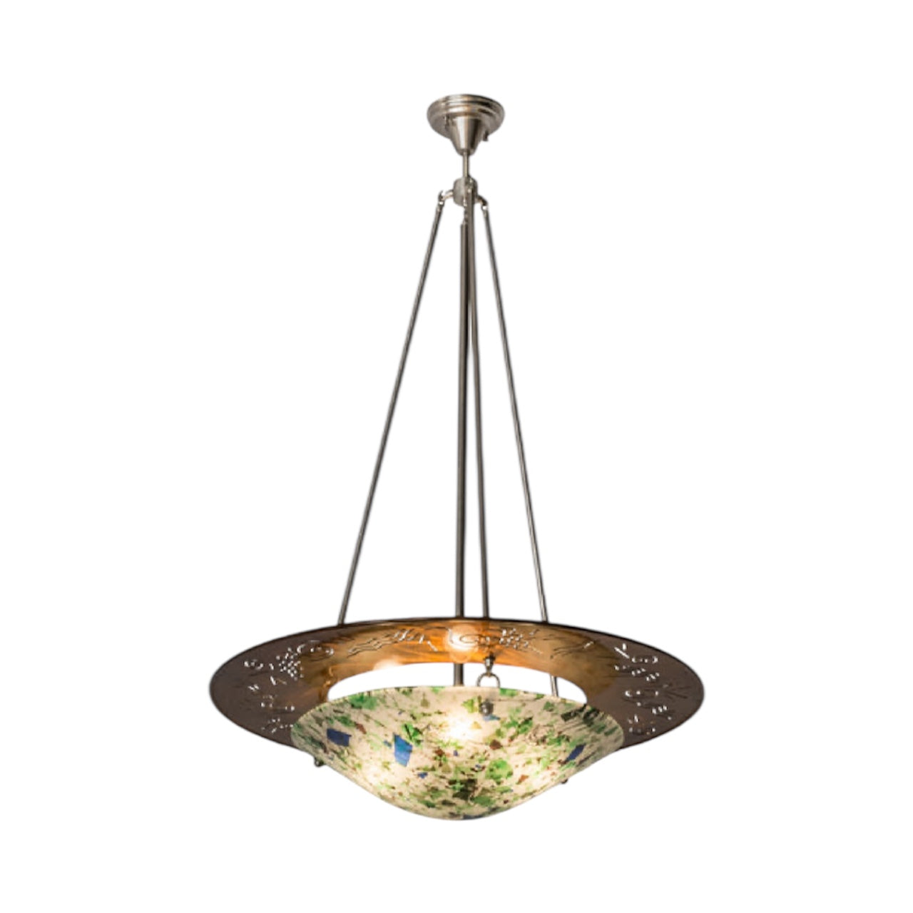 Contemporary. Elegant. Imaginative.An awe-inspiring fusion of art and light, this striking pendant transforms any space into a celestial gallery. Handmade in the USA, this stunning art piece showcases high-fired fused glass in vivid Leaf and Avocado Greens, complemented by Cerulean and Azure Blues over a crisp White background. The vibrant colors create a mesmerizing glow, adding visual excitement and ambiance to any setting.