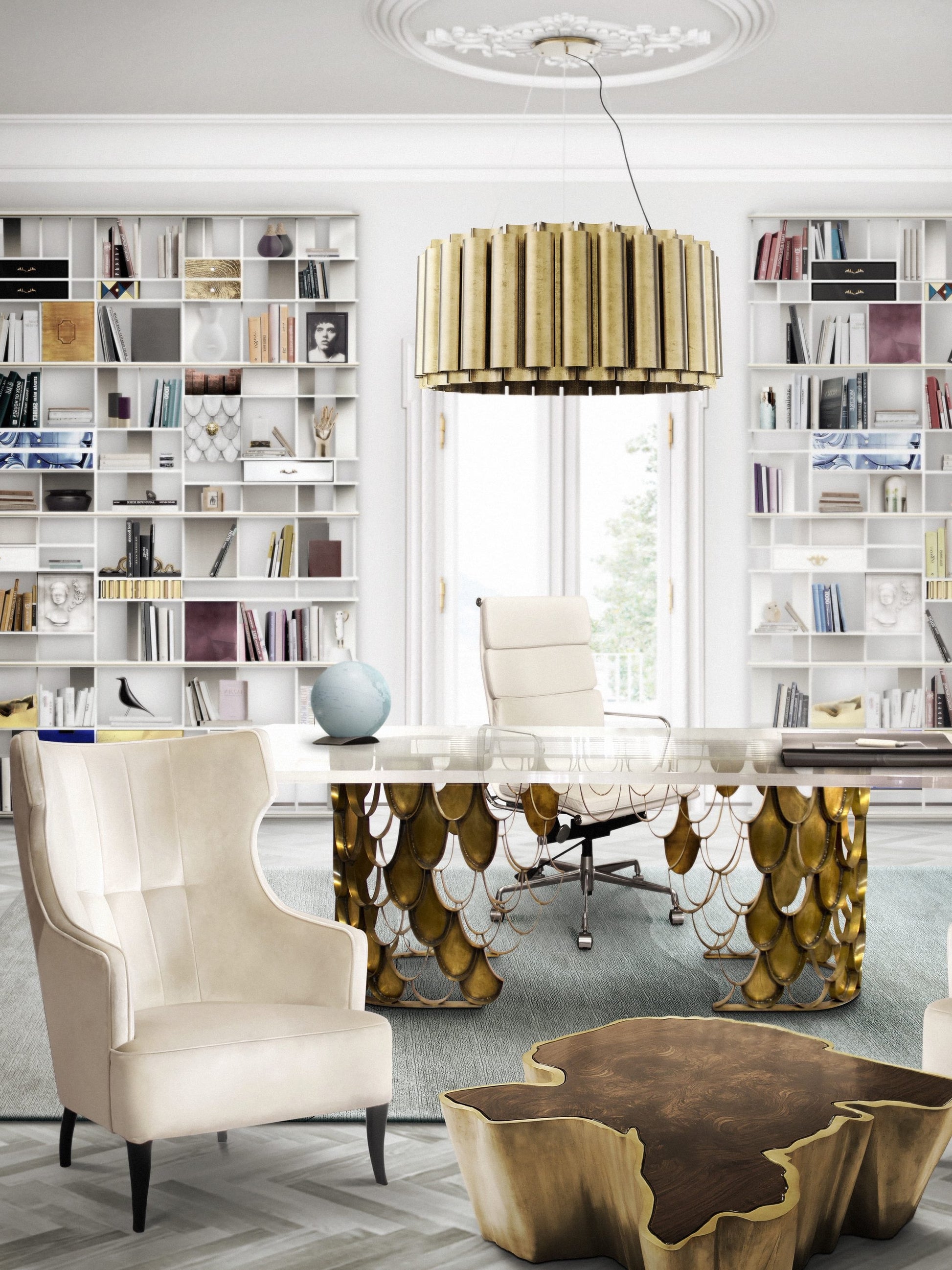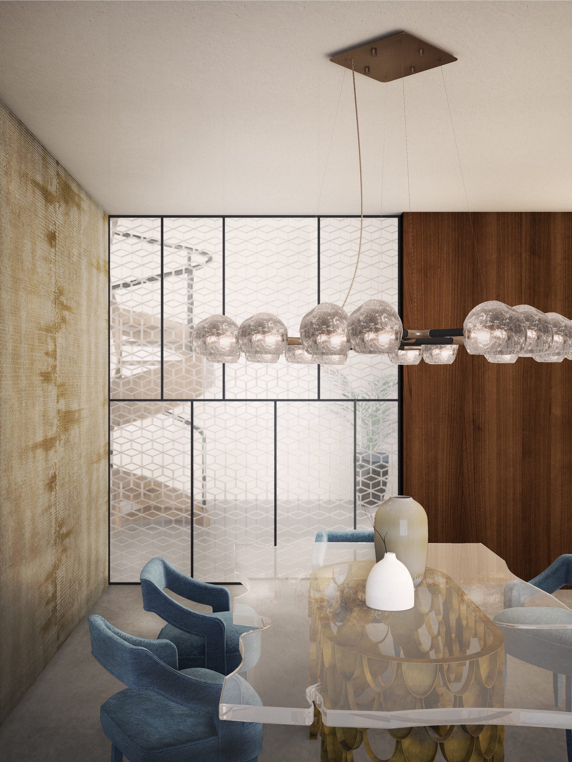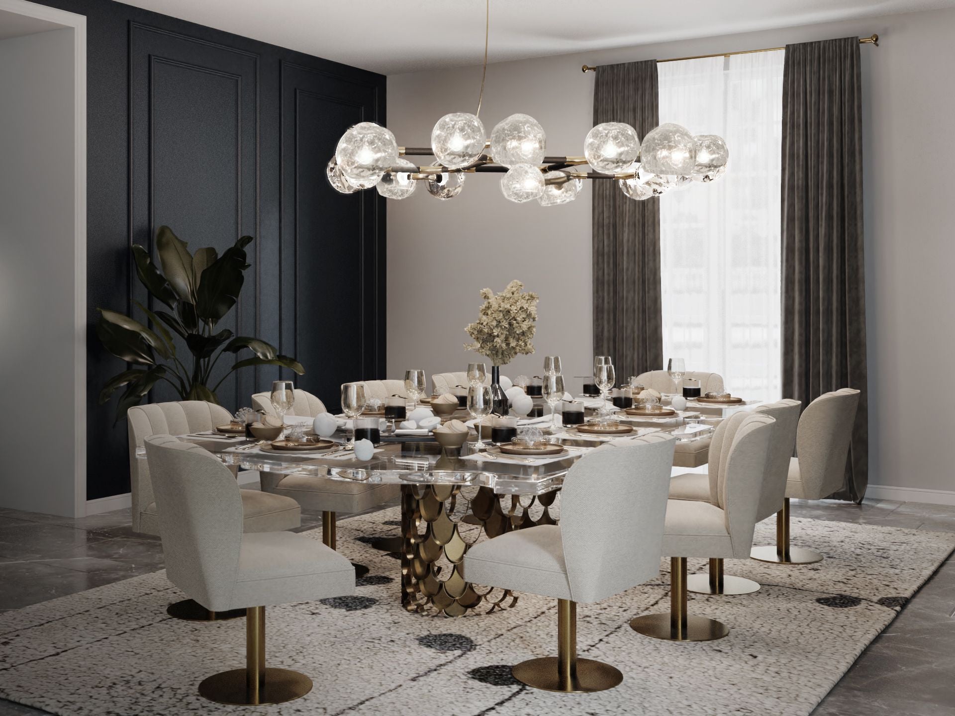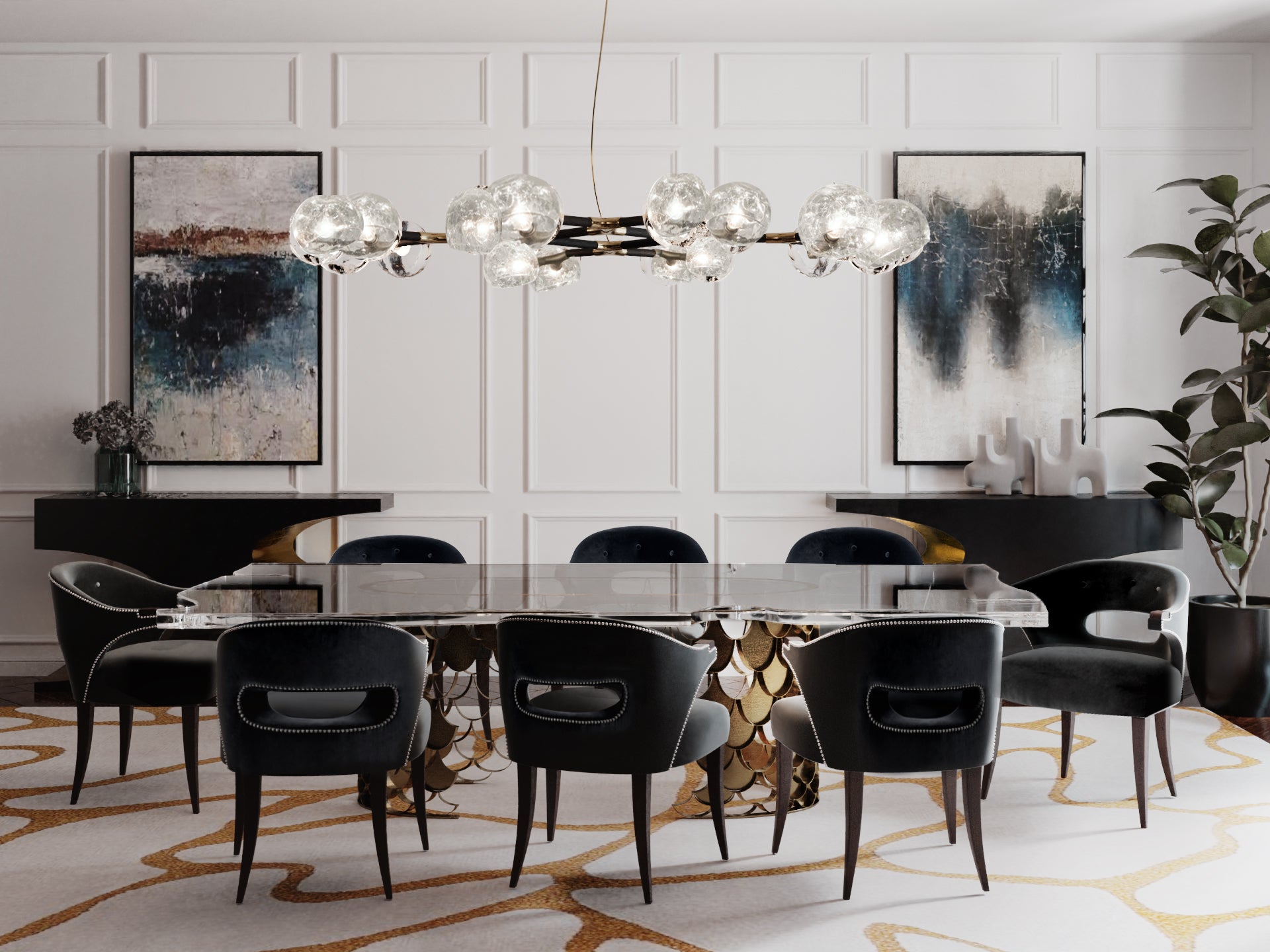 The Koi II Dining Table has a brushed brass matte base imitating the Koi Carp scales and a tabletop in acrylic. Inspired by the Koi Carp, the symbol for love and friendship in Japanese culture, this modern contemporary rectangular dining room table is the ideal addition to your modern dining room furniture set, fit to have long conversations over and unforgettable dinners.