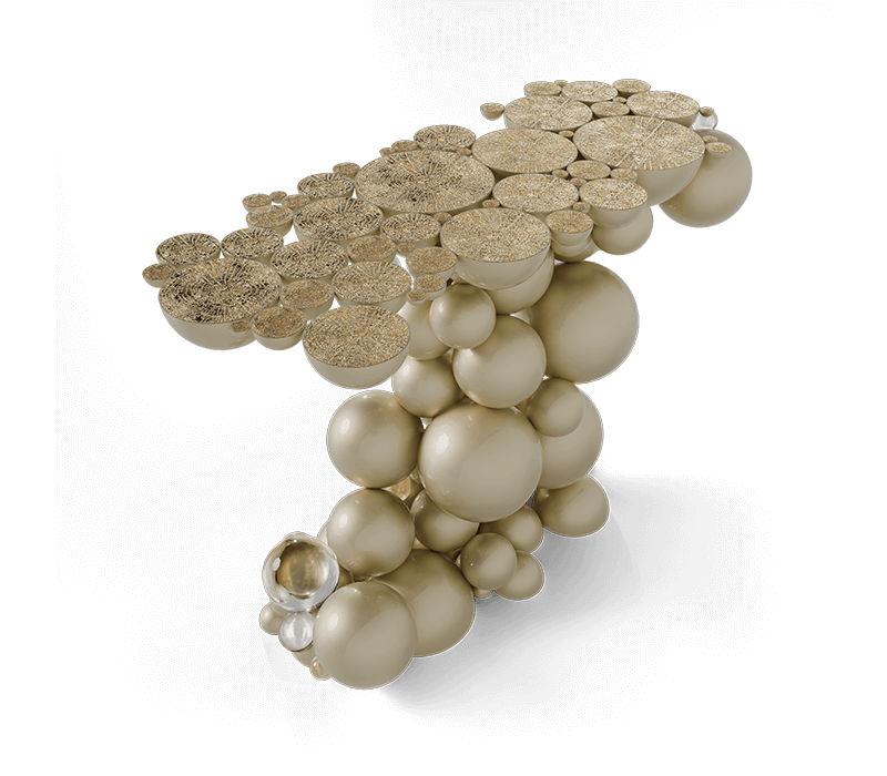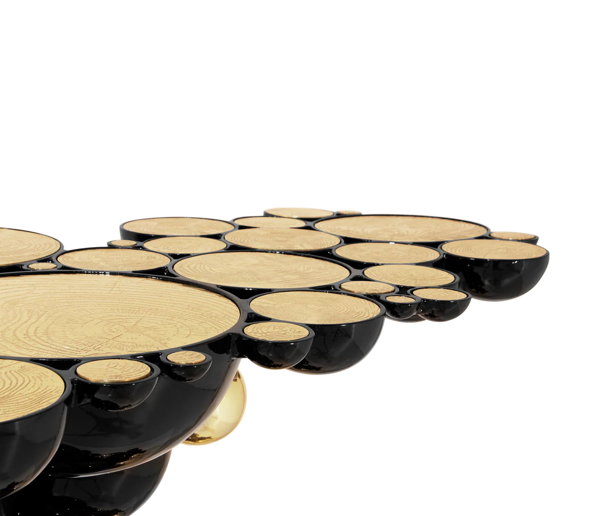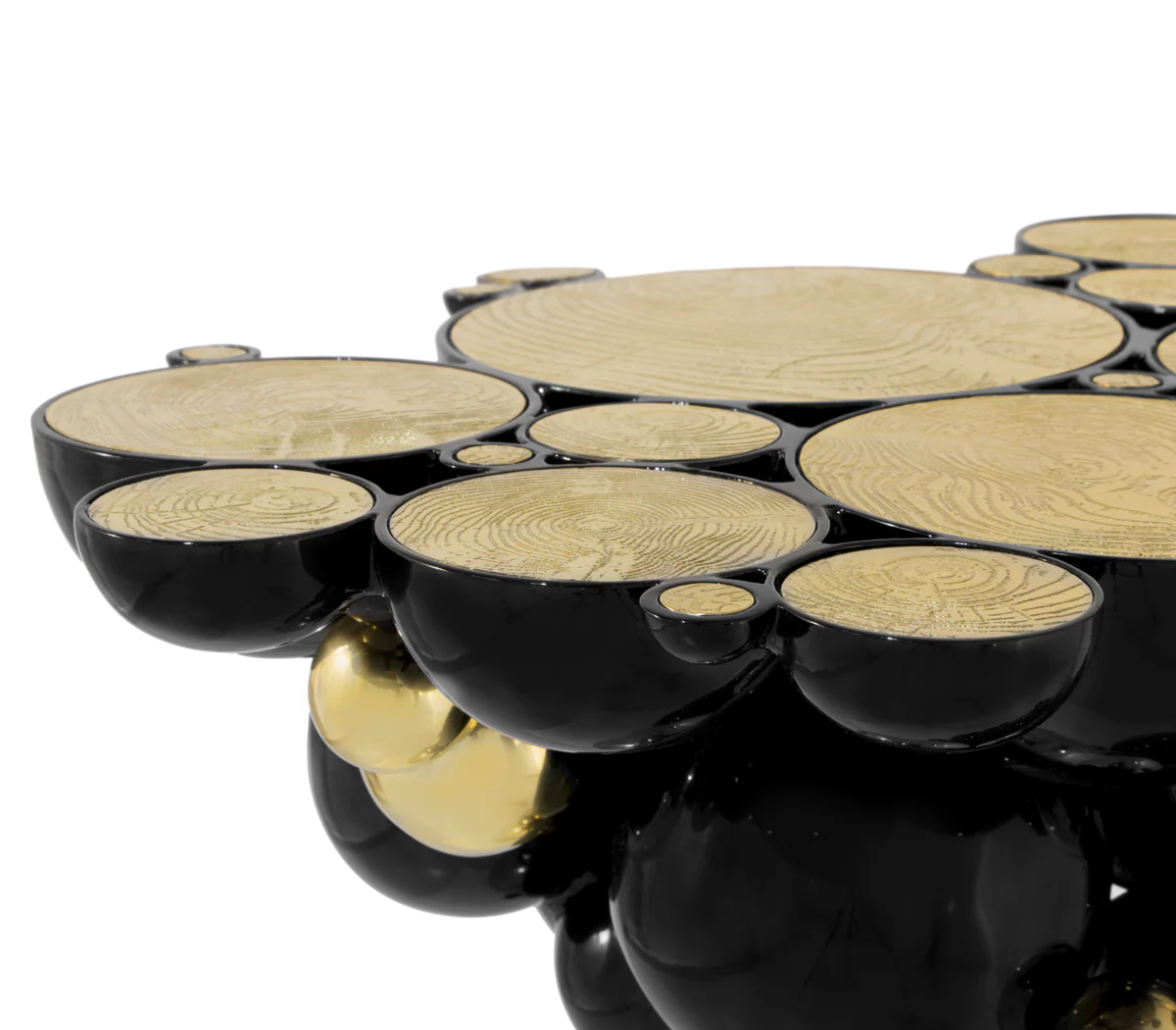 Defying the laws of physics, the Newton black and gold console has grown from the ancient art of casting metal, where metal is heated until molten into spheres and semi-spheres shape. One by one, each element is joint to produce an outstanding pattern and organic structure, finished in a dramatic black lacquer and gold plated accents. The top of this console table is composed of brass circles carved with a golden texture similar to organic wood texture. A contemporary console that carries cultural legacy while successfully moves towards the future, remaining ahead of the of the design scene. A real expression of exclusivity and high collectible craftsmanship outcome.