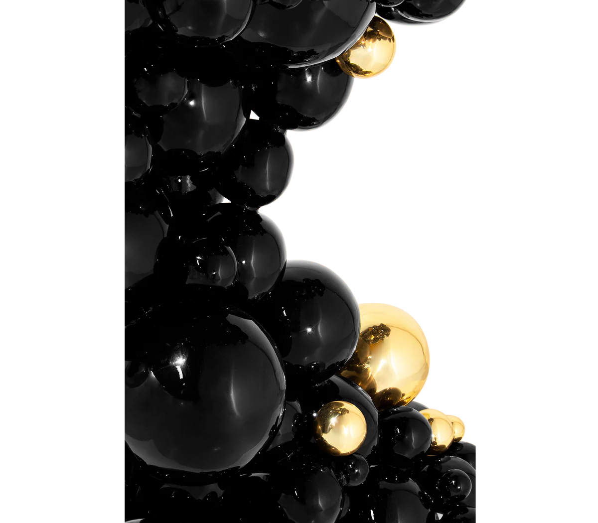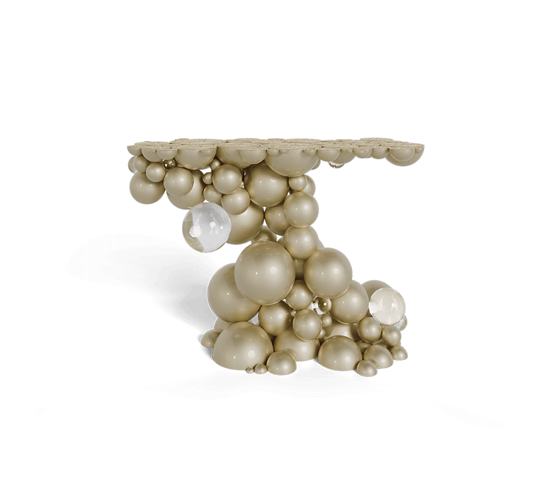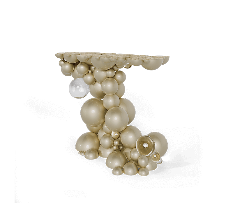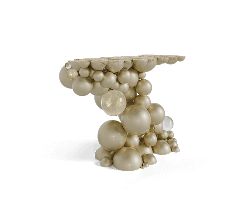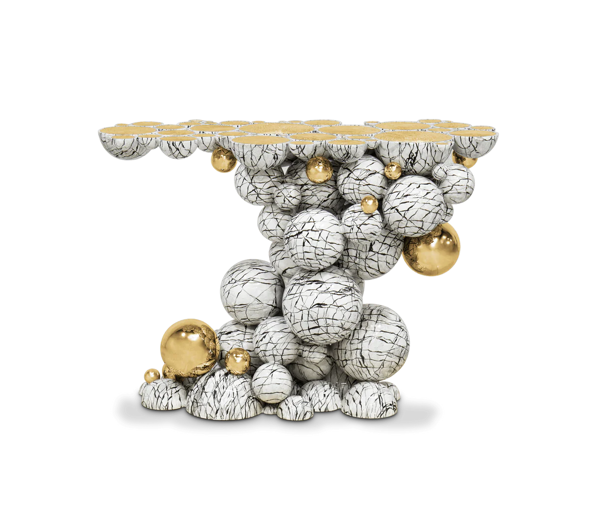 Defying the laws of physics, the Newton black and gold console has grown from the ancient art of casting metal, where metal is heated until molten into spheres and semi-spheres shape. One by one, each element is joint to produce an outstanding pattern and organic structure, finished in a dramatic black lacquer and gold plated accents. The top of this console table is composed of brass circles carved with a golden texture similar to organic wood texture. A contemporary console that carries cultural legacy while successfully moves towards the future, remaining ahead of the of the design scene. A real expression of exclusivity and high collectible craftsmanship outcome.